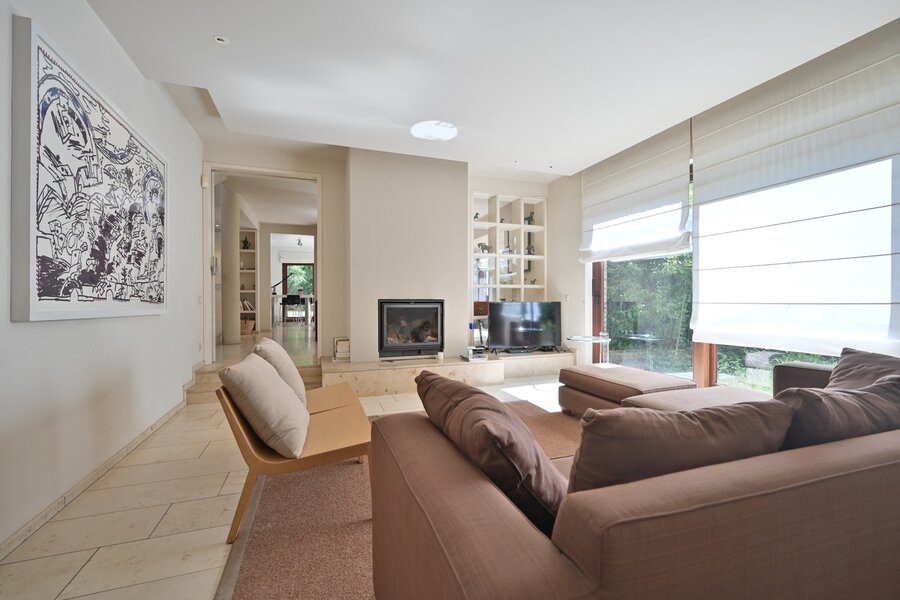 De ruime living baadt in natuurlijk licht, wat bijdraagt aan een warm en uitnodigend gevoel. Een stijlvolle haard vormt het hart van de woonkamer en zorgt voor extra gezelligheid tijdens de koudere maanden. Twee elegante wandrekken omkaderen het geheel en geven de ruimte een harmonieus karakter.