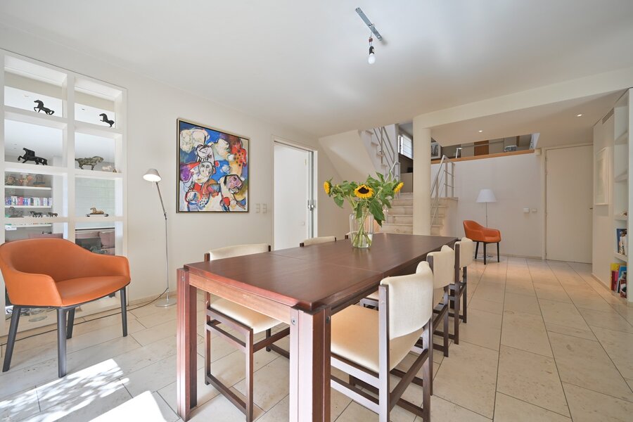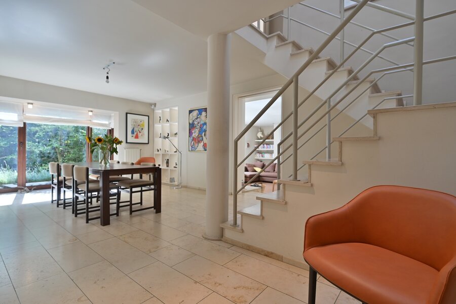 Bij het betreden van de woning ervaar je meteen de ruimtelijkheid en het doordachte lijnenspel dat kenmerkend is voor het werk van Simoni Vittorio. De woning beschikt over een volwaardige praktijkruimte met aparte ingang, voorzien van een wachtzaal en afzonderlijk toilet – ideaal voor zelfstandigen of vrije beroepen die werk en privé willen combineren zonder in te boeten aan privacy of comfort.