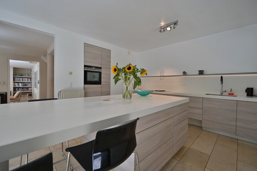 Deze ruime en volledig vernieuwde keuken (6 jaar geleden gerenoveerd) combineert functionaliteit met stijl. Dankzij de rechtstreekse verbinding met de tuin geniet u hier van veel natuurlijk licht en een vlotte overgang naar buiten.