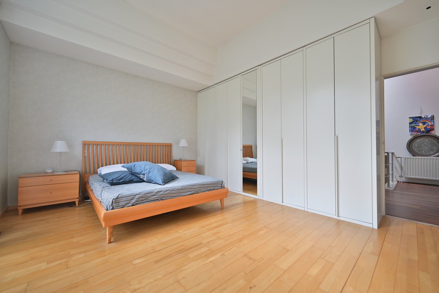 Ook hier werd de parketvloer mooi doorgetrokken, wat zorgt voor een warme en uniforme uitstraling in het volledige slaapgedeelte.