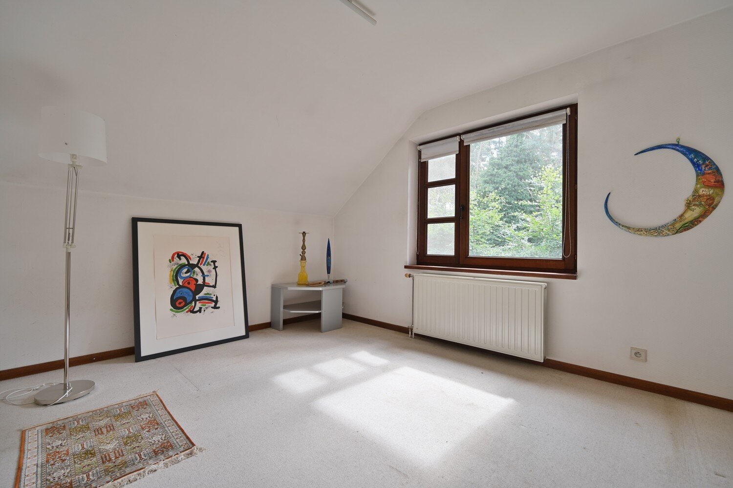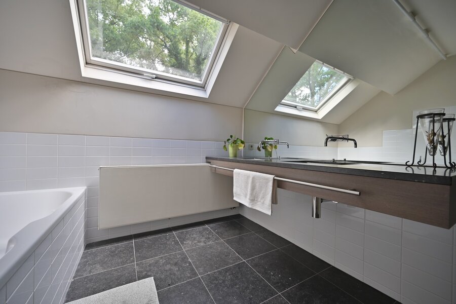 Dankzij de twee Veluxramen baadt de ruimte in natuurlijk licht, wat bijdraagt aan een frisse en ontspannen sfeer.