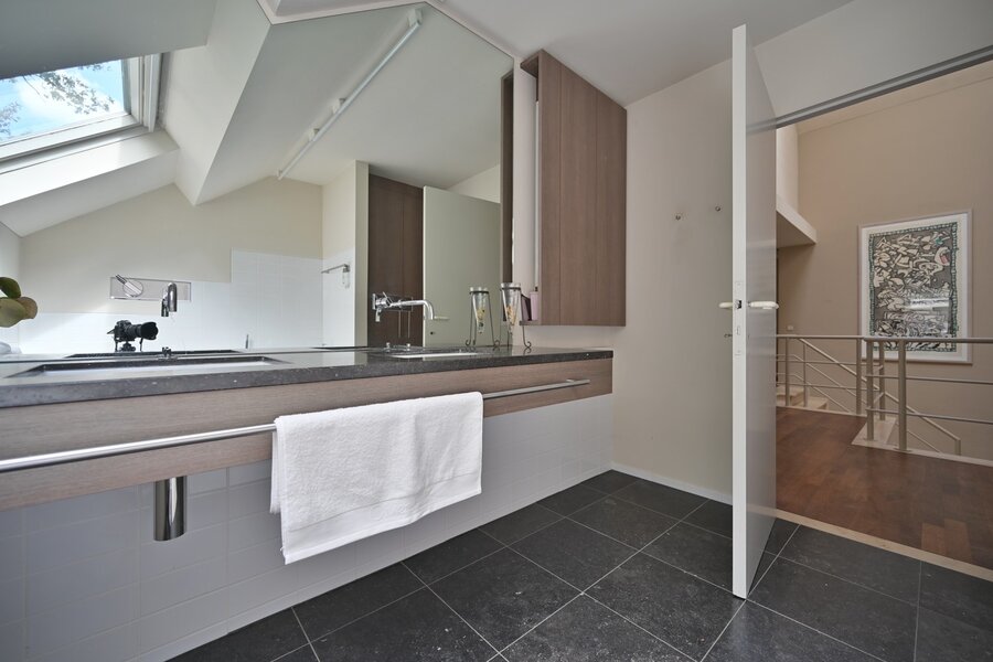 Deze modern ingerichte badkamer combineert comfort met klasse. Ze is uitgerust met een dubbele wasbak, een ligbad en een hoogwaardige natuurstenen vloer die zorgt voor een luxueuze uitstraling.