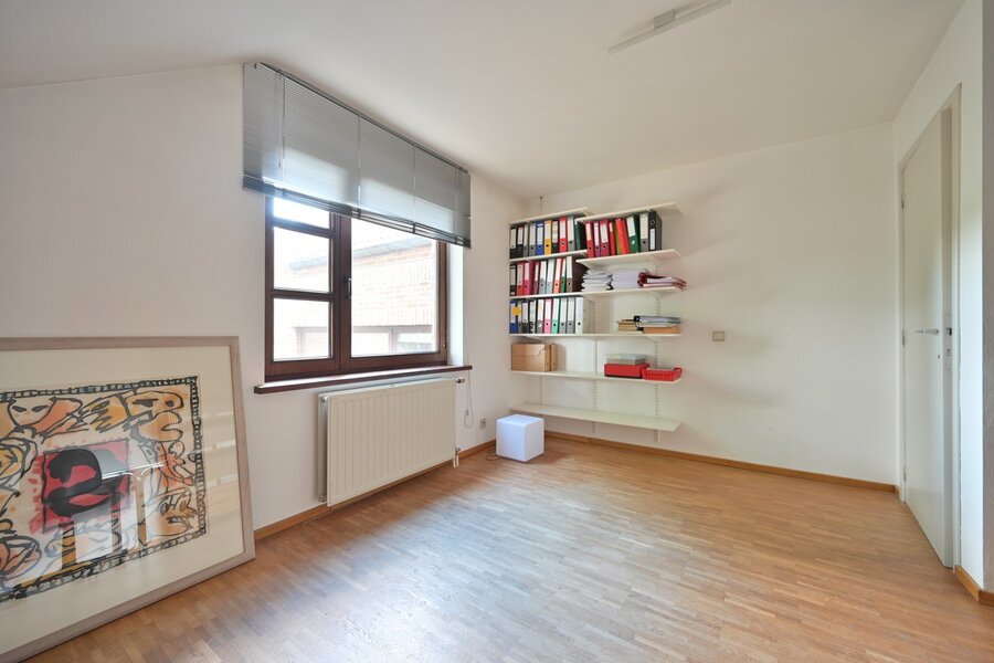 Via de eethoek bereikt u, met slechts enkele treden, een open en lichtrijke bureelruimte van 10 m². Deze slimme tussenverdieping vormt een stijlvolle overgang tussen de eetkamer en de ruime overloop.
