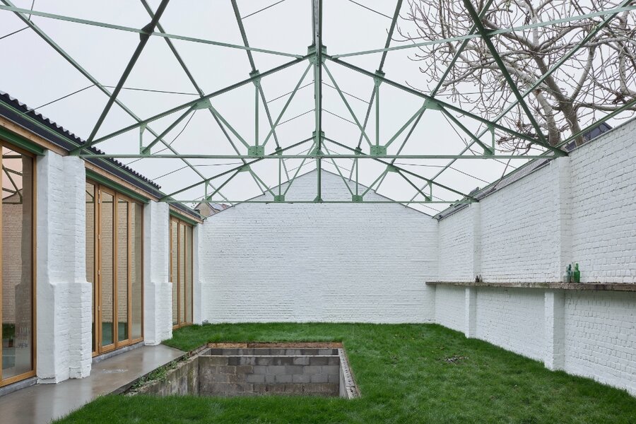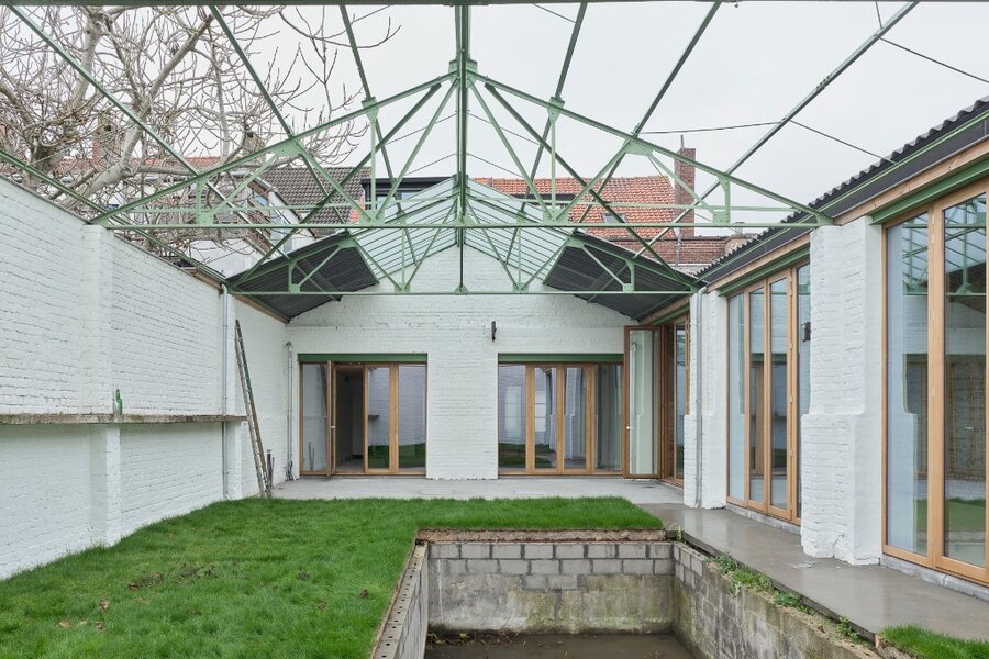 De staalstructuur van het magazijn werd uitgepuurd tot haar materialistische eenvoud. Onder deze stalen structuur werd een bijzondere buitenruimte gecreëerd, een oase in de stad, waarrond zich de woning en het atelier bevinden. De woning en het atelier ondergingen een totaalrenovatie waarbij de constructieve elementen — namelijk de houten constructie — zichtbaar bleven. Diezelfde puurheid in materialisatie en ruimtelijkheid wordt zowel in het exterieur als het interieur doorgetrokken.