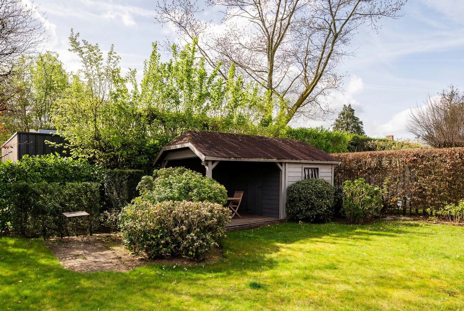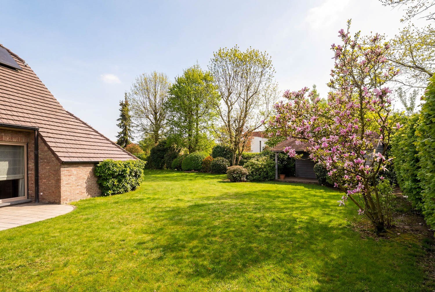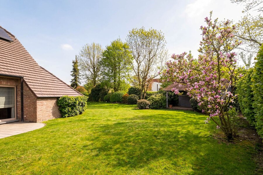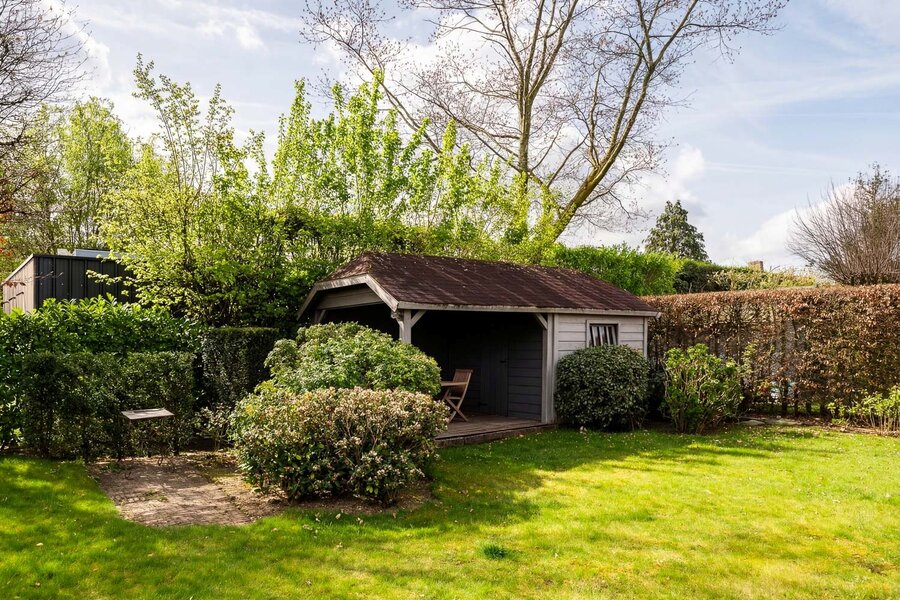De zonnige tuin wordt vervolledigd door een tuinhuis met geïntegreerd overdekt terras.