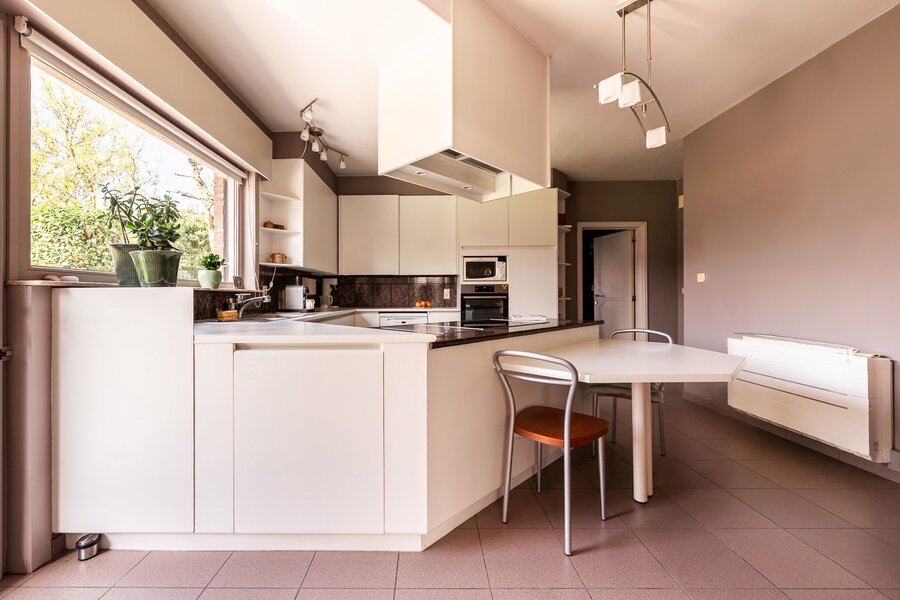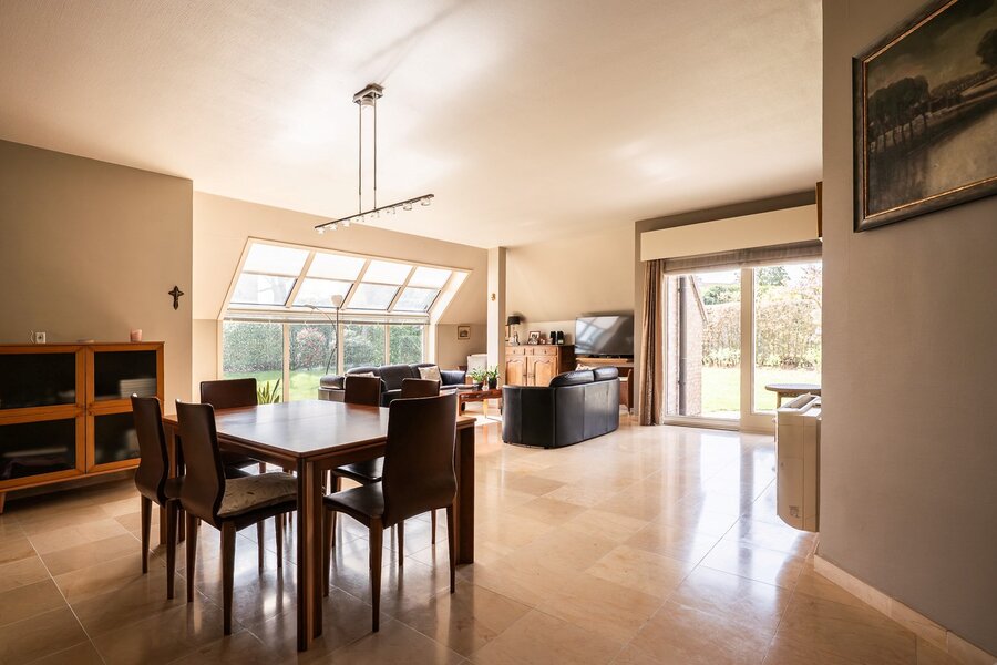 De leefruimte opent zich volledig naar de tuin en wordt gekenmerkt door grote raampartijen en een natuurlijke lichtinval. Aansluitend bevindt zich de ruime keuken met praktische berging.