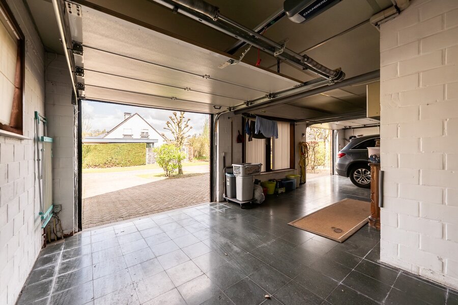 Het gelijkvloers omvat verder een bureau en twee inpandige garages met een wasplaats.