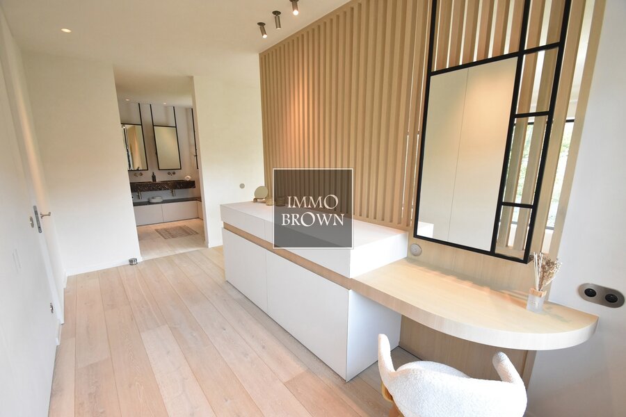 Entrée avec ascenseur (de -1 à +1), vestiaire et toilettes invités. Salon et salle à manger agréables et lumineux, équipés d'un feu au gaz, avec de grandes baies vitrées donnant sur la terrasse et le jardin orientés sud. Cuisine ouverte entièrement équipée avec tout le confort et appareils électroménagers. Buanderie pratique. Au 1er étage : luxueuse chambre principale avec dressing spacieux et salle de bains avec baignoire, douche, double lavabo et toilettes. 2e, 3e et 4e chambres avec chacune une salle d'eau attenante (douche, lavabo et toilettes). Au 2e étage : 5e et 6e chambres avec salle de douche commune. Local technique et grenier. Garage intérieur. Parking extérieur pour plusieurs voitures.