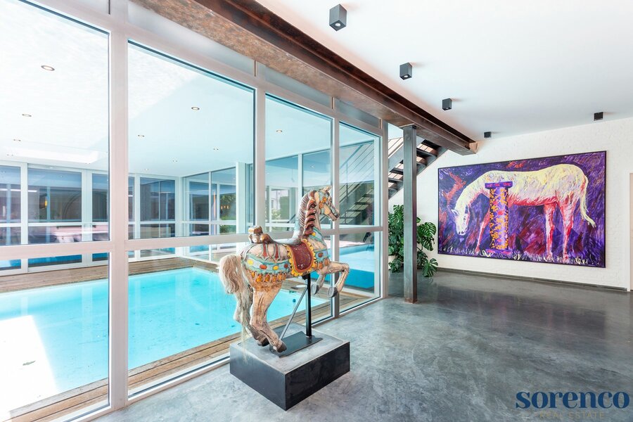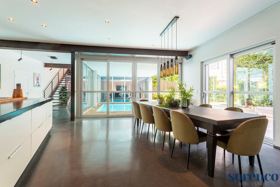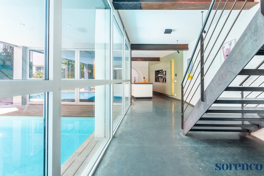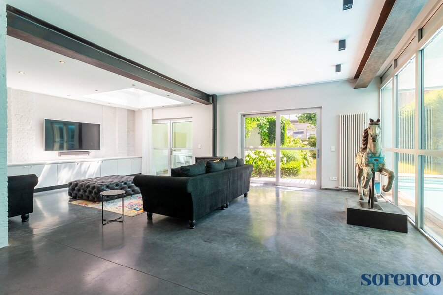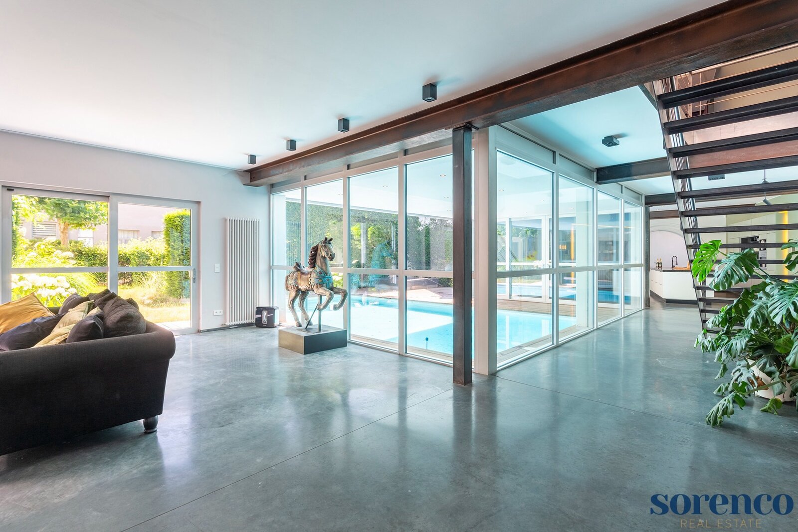 De stijlvolle leefruimte op een gepolierde vloer met betonlook plafond geniet van overvloedig natuurlijk licht. Een design gastentoilet met marmeren lavabo, een herentoilet en een kindertoilet vervolledigen het gelijkvloers, samen met een comfortabele salon, een bureauruimte, een TV-hoek en een geïntegreerde Sonos muziekinstallatie. De praktische was- en technische ruimte is voorzien van onder andere een zwembadinstallatie van De Dietrich, vloerverwarming en gasverwarming.