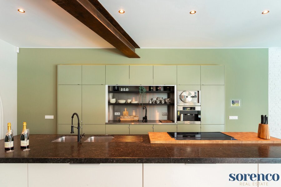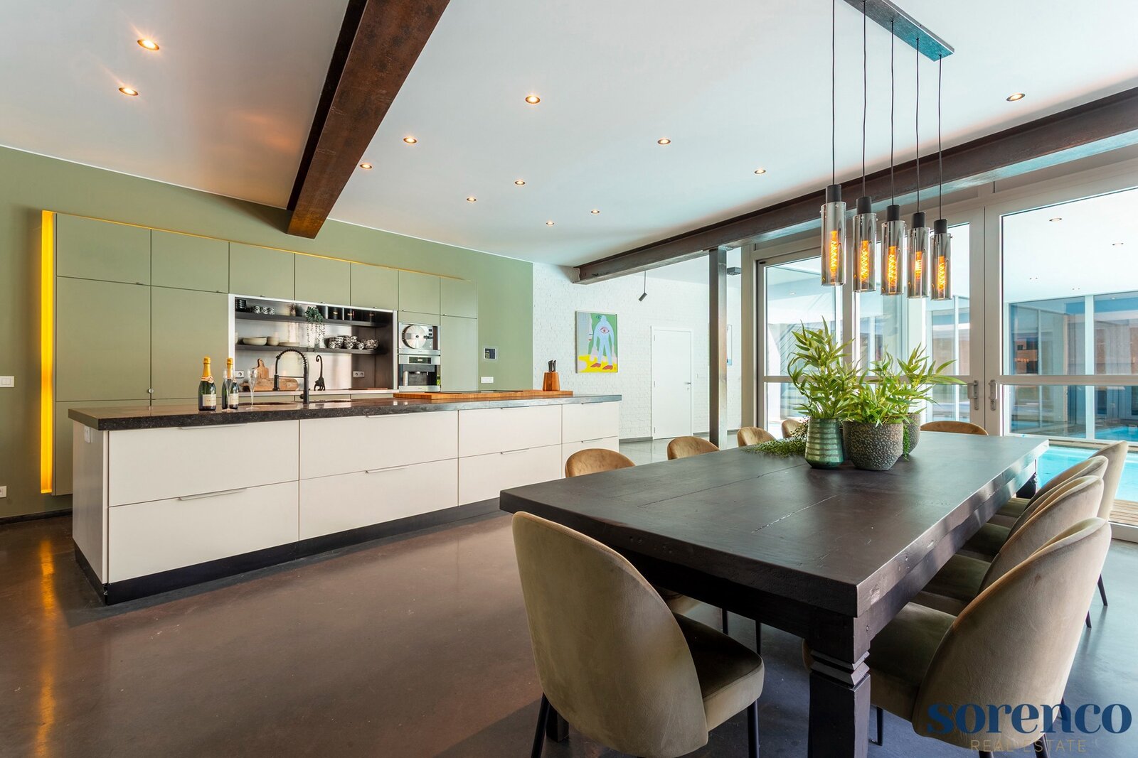 Bij binnenkomst via de inkomhal betreed je meteen de modern ingerichte open keuken, uitgerust met hoogwaardige Miele-apparaten (vaatwasser, steamer, hete luchtoven, inductiekookplaat, koffiemachine) en een werkblad in blauwe hardsteen. Het royale kookeiland vormt samen met de strakke inrichting een opvallende blikvanger en gaat naadloos over in de eethoek. Dankzij de grote schuifdeuren is er een directe verbinding met het cosy overdekte terras, de prachtig aangelegde tuin en het zwembad met jacuzzi, waardoor binnen- en buitenleven naadloos in elkaar overvloeien.
