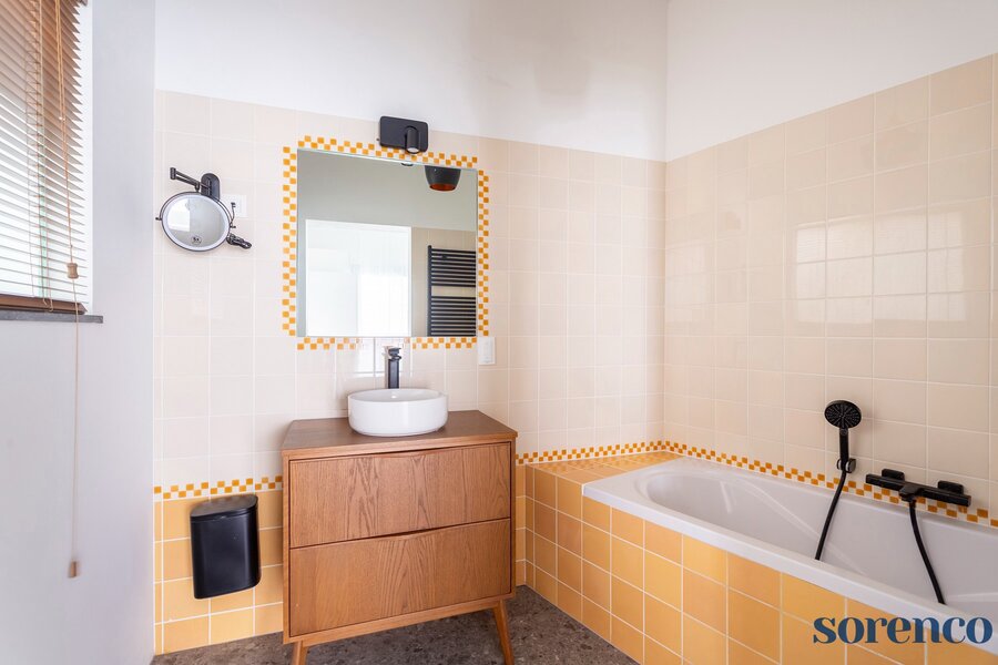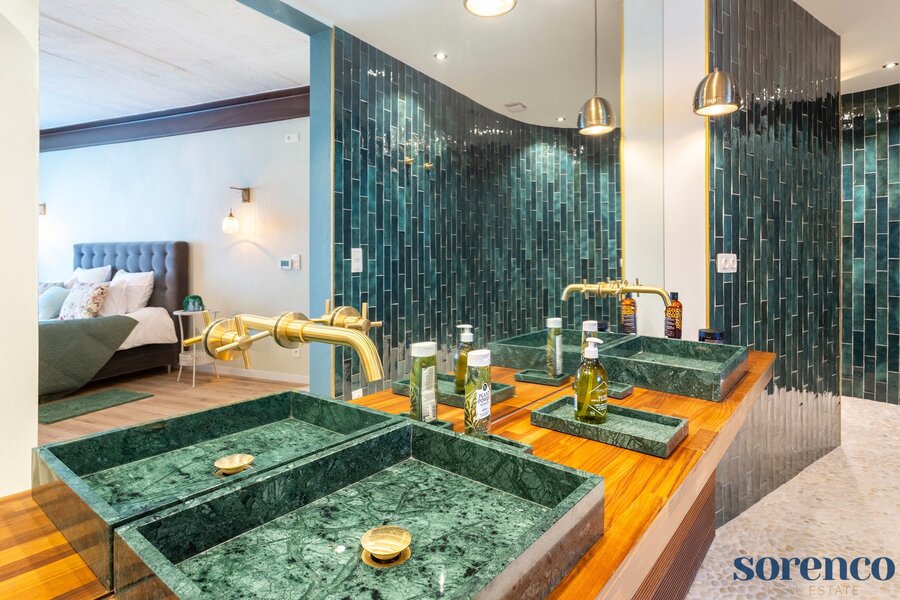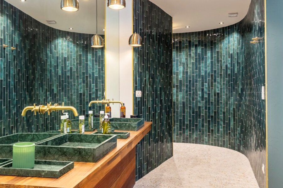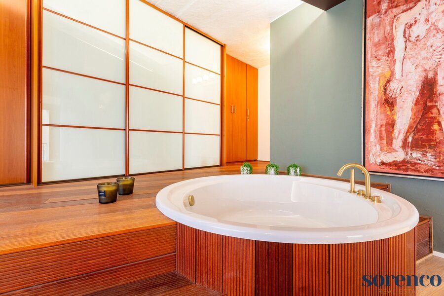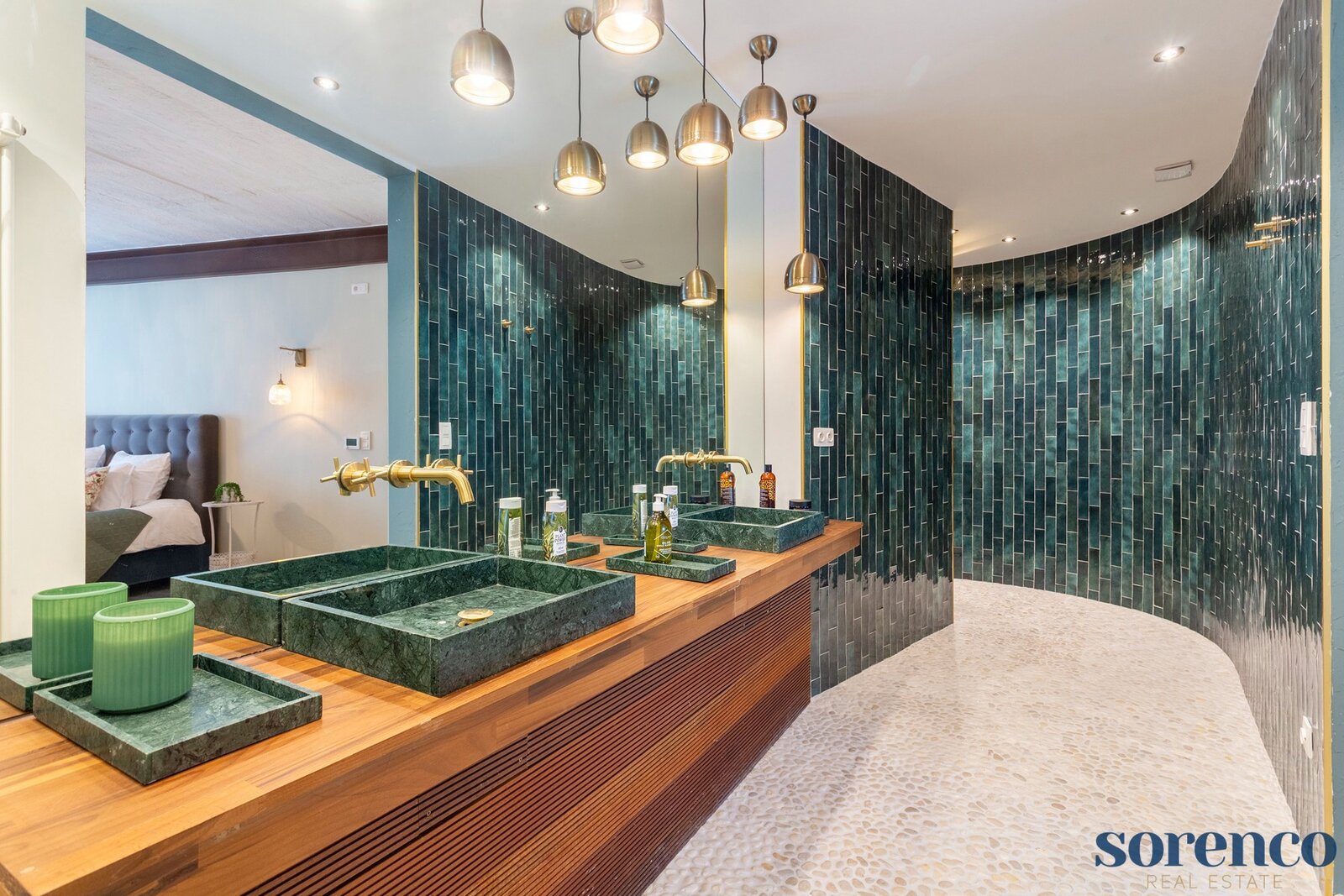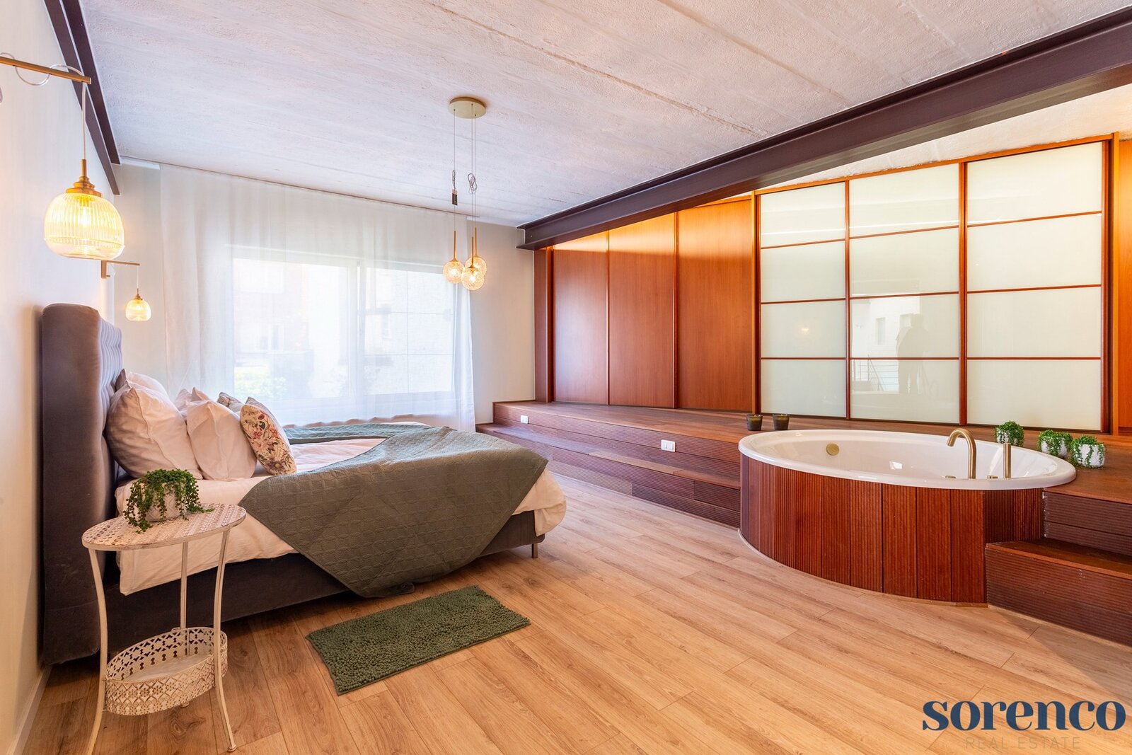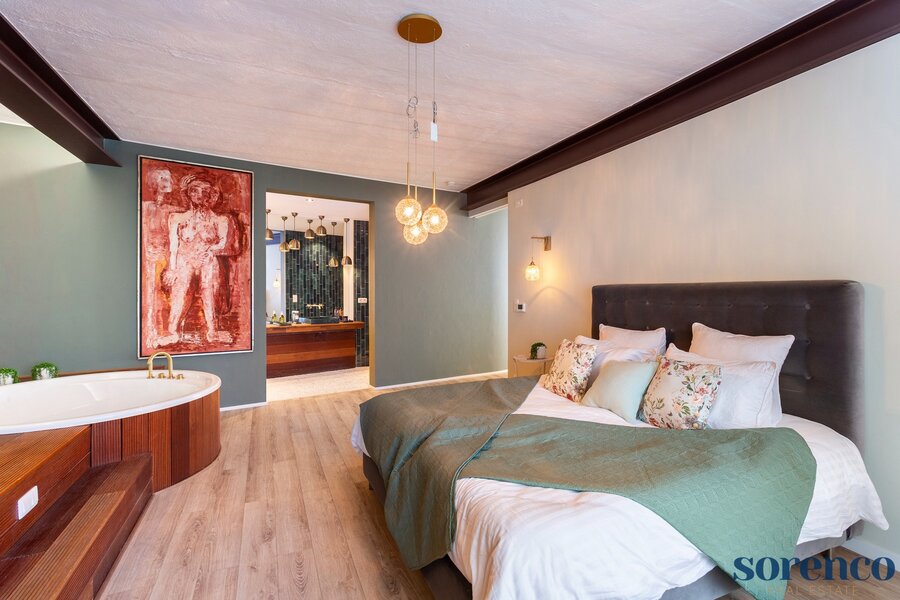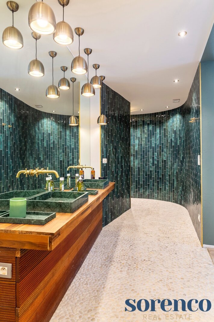 Via een brede trap bereik je de eerste verdieping, waar een royale overloop alle slaapkamers en het terras met elkaar verbindt. De masterbedroom is uitgerust met een zesdeurs kastenwand en een luxe badkamer in groene tegels, voorzien van een jacuzzi, een grote inloopdouche en een dubbele wastafel. Daarnaast zijn er drie slaapkamers, elk met hun eigen kleuraccent, ingebouwde kastenwand en private badkamer met moderne faciliteiten zoals een inloopdouche en een stijlvolle wastafel. Een extra kamer met kastenwand kan perfect dienen als bureau of bijkomende slaapkamer.