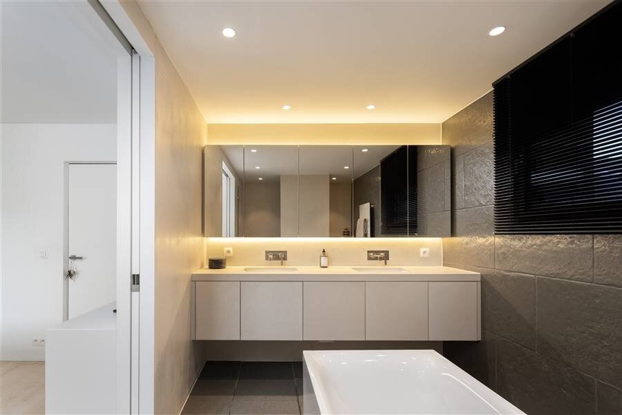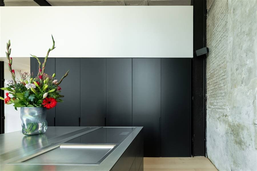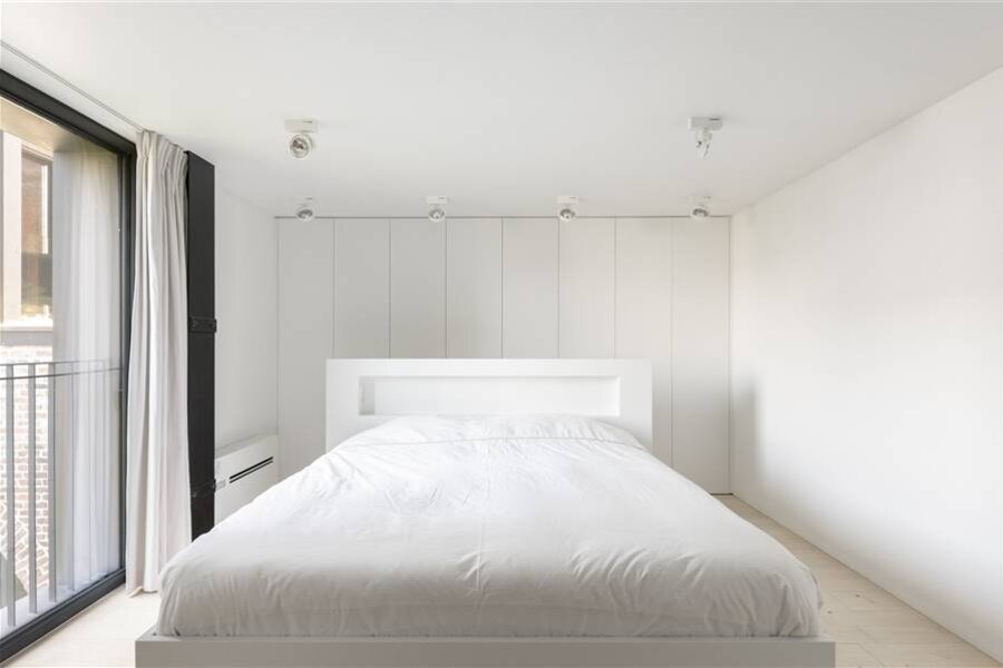 Les impressionnants plafonds de 5 mètres de haut font de l'espace de vie un lieu unique. Il se compose d'un coin salon et d'une grande salle à manger adjacente à la cuisine ouverte. La cuisine est équipée d'appareils électroménagers Gaggenau de haute qualité. L'îlot de cuisine est en acier inoxydable. La chambre à coucher avec salle de bains attenante, équipée d'un double lavabo, d'une baignoire, de toilettes et d'une douche à l'italienne, est accessible par le couloir de nuit. De plus, ce hall de nuit mène à la buanderie/rangement séparée qui est également accessible par le hall d'entrée.