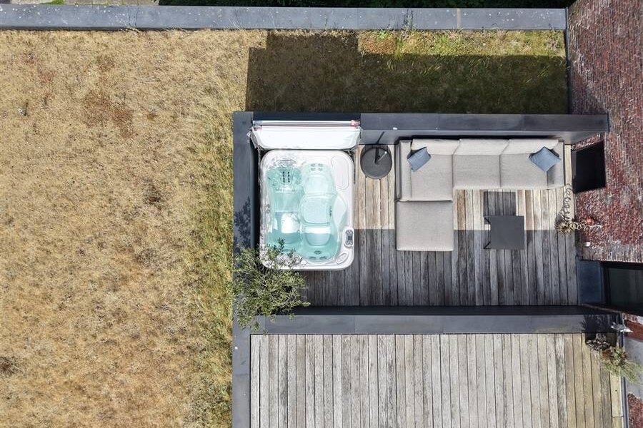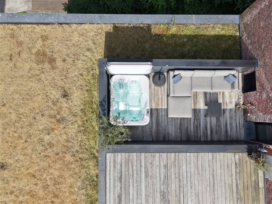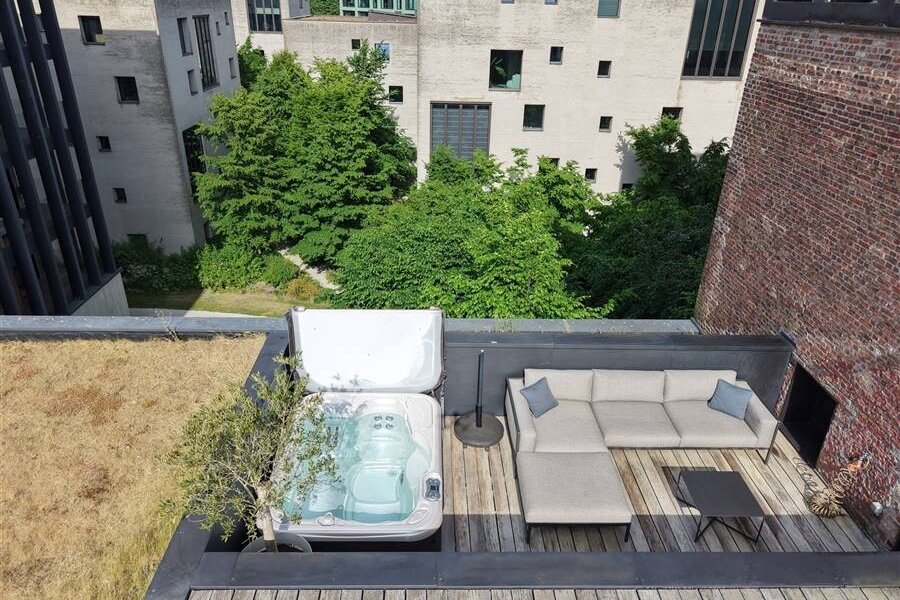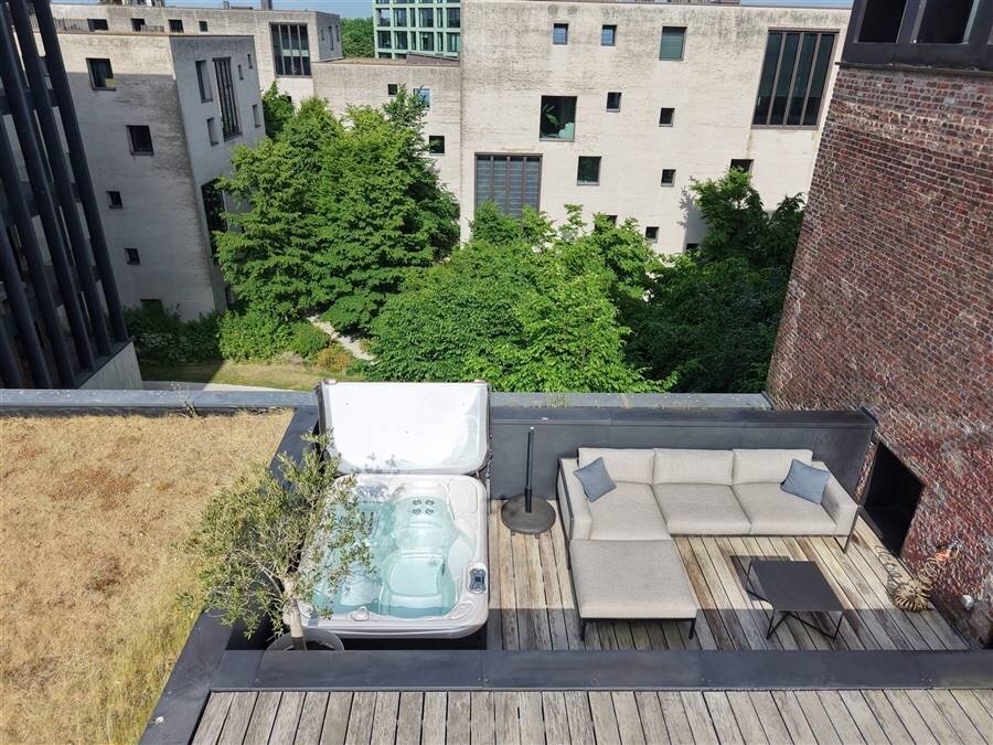 Terrasse ensoleillée spacieuse avec espace pour un jacuzzi et un salon. Actuellement, la mezzanine a été transformée en espace de vie supplémentaire et en coin TV.