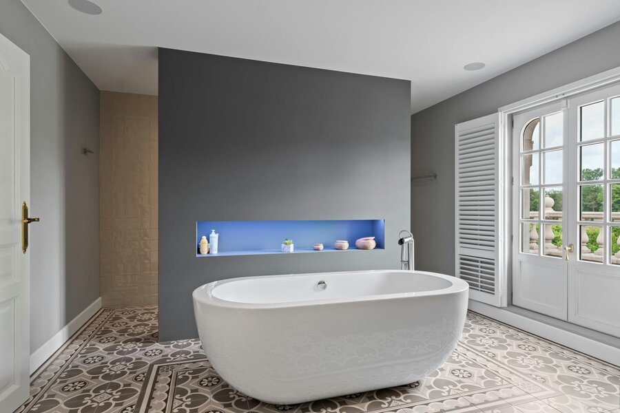 - salle de bain avec baignoire îlot, douche à l'italienne à effet pluie, double vasque