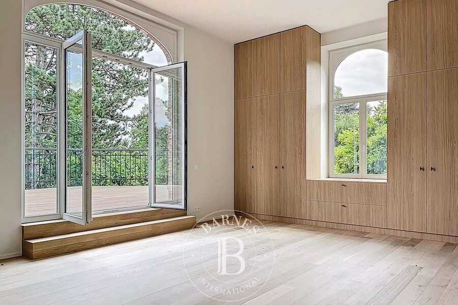 Au premier étage, la chambre master avec son antichambre/bureau, son dressing, sa salle de bains/douche avec toilette séparée et son accès privatif à la grande terrasse sans aucun vis à vis surplombant la verdure environnante.