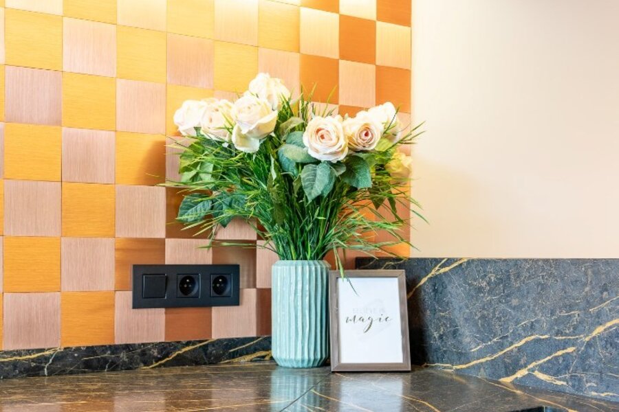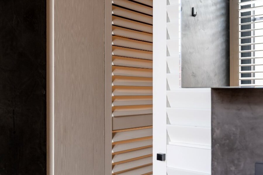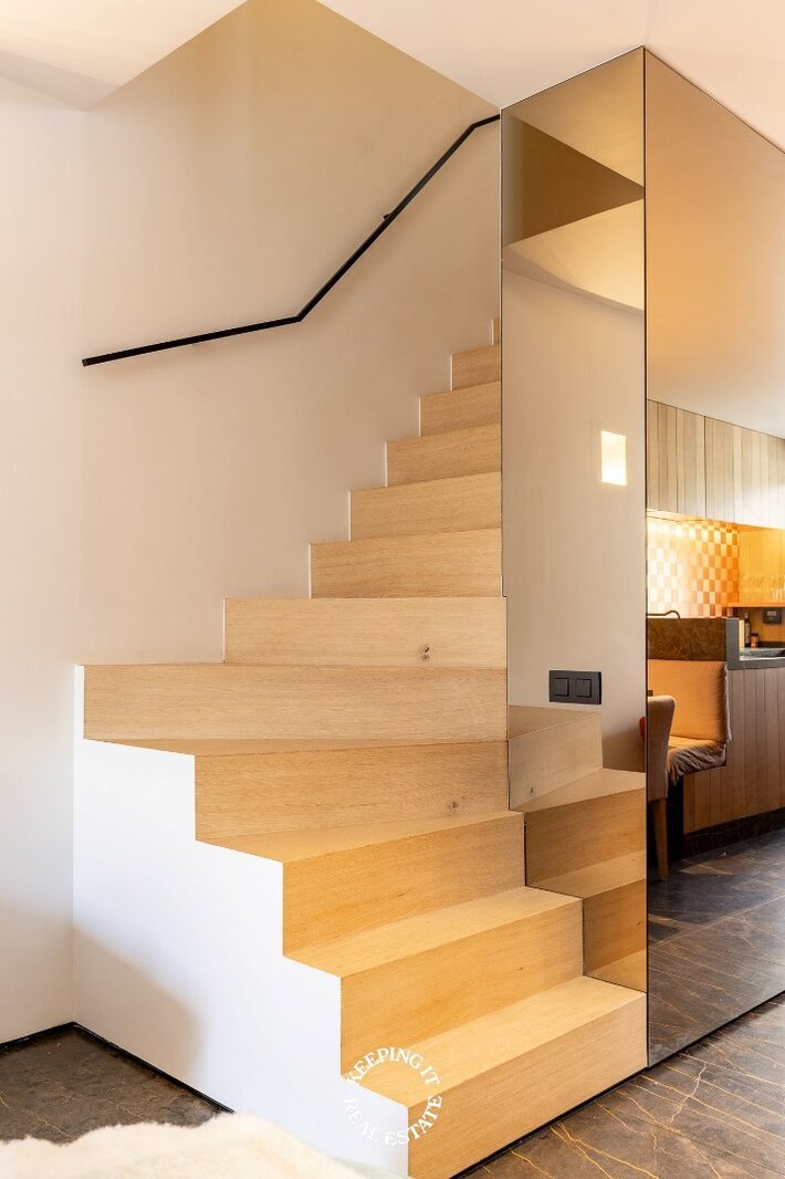 Deze parel is als volgt ingedeeld: een inkomhal met discrete opbergoplossingen en een gastentoilet. De keuken is het kloppende hart van de woning: een uitgesproken combinatie van functionaliteit en karakter, met koperen dambordtegels, geïntegreerde zitbank en spiegelwanden. Aansluitend de leefruimte met maatkasten en schuifpaneel-tv-wand — alles in lijn met de architecturale taal van het huis. Het terras is zongeoriënteerd en onderhoudsvriendelijk, met doorgang naar de achterliggende garage (mogelijkheid tot aankoop van drie extra garages).