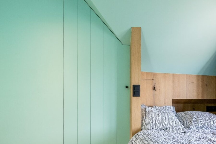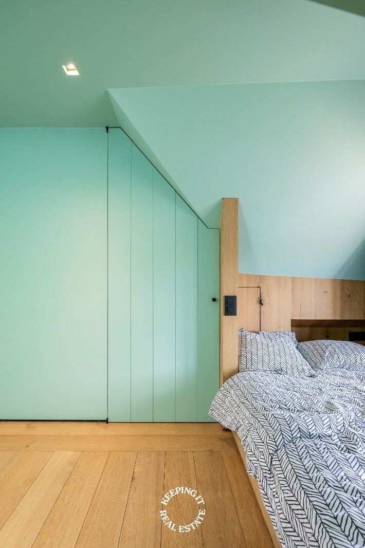 Op de eerste verdieping treft men een lichtrijke bureau aan de voorzijde met uitzicht op het water. Verder een aparte dressing met Indische deuren, gastentoilet en de master met ensuite badkamer afgewerkt in tadelakt en marmer (Carrara CD). Op het tweede verdiep is er een ruime tweede slaapkamer met geïntegreerd bed met zicht op het water, maatkasten en ensuite badkamer met marmeren wastafel en inloopdouche, een praktische wasruimte en zolderberging. Tot slot is deze topper energiezuinig met een B-label (134 kWh/(m²jaar).