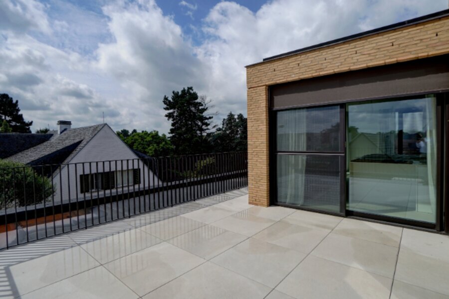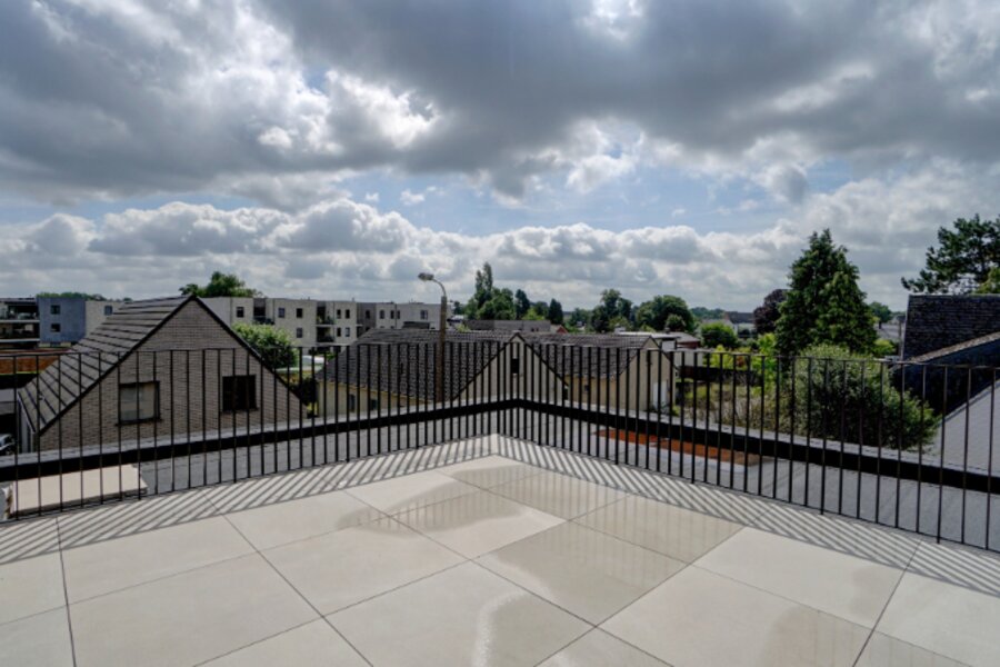 Omvat: inkomhal met vestiaire, ruime en zonnige living met open volledig ingerichte luxe keuken, zeer ruim dakterras van 31m² op het zuiden, 2 slaapkamers met dressingkasten, douchekamer, wc, koele berging, wasplaats.