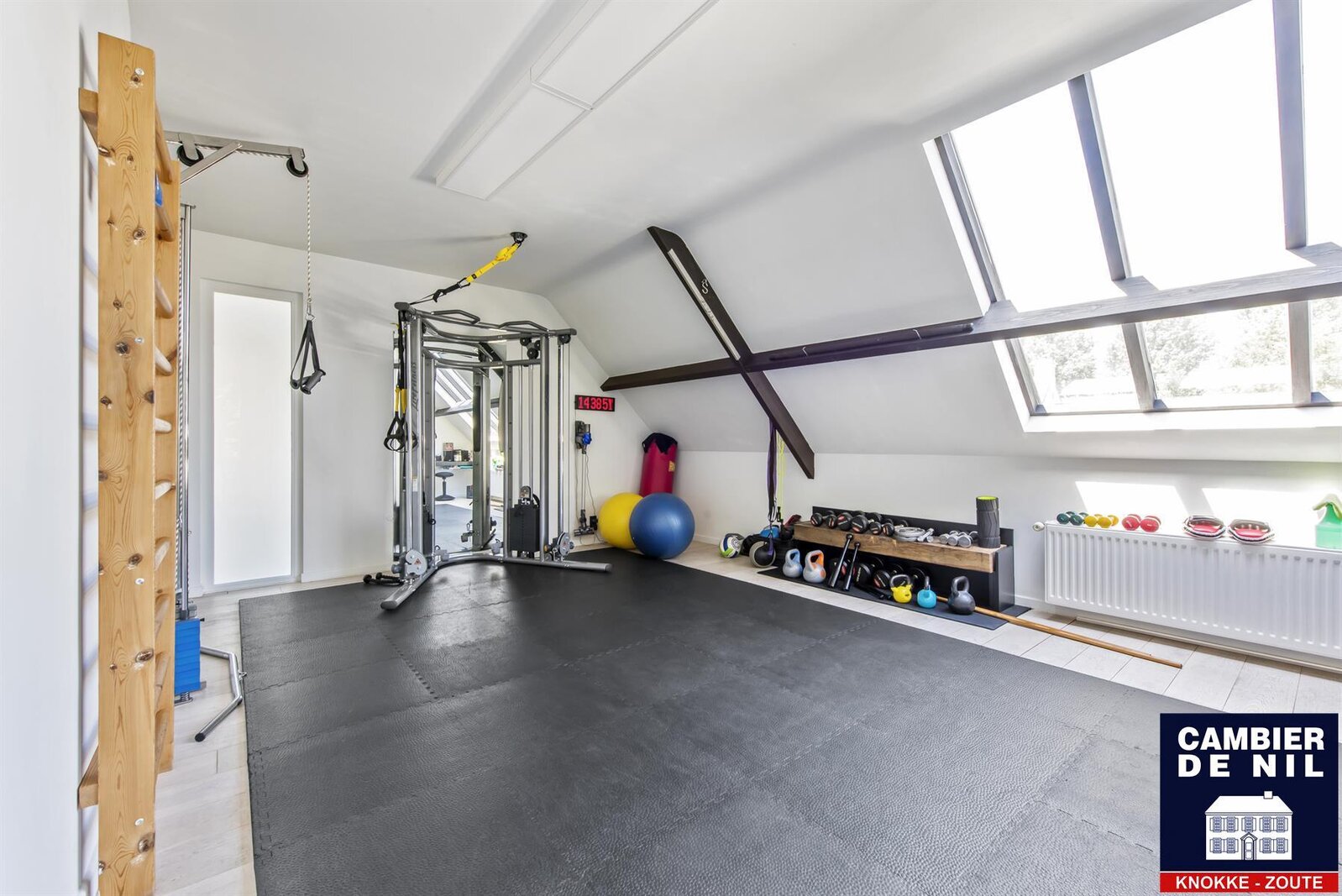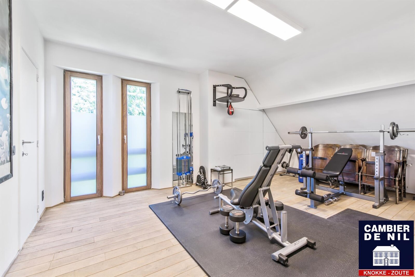 Premier étage : trois chambres, une salle de bains, et une grande salle de fitness baignée de lumière. Deuxième étage : chambre principale généreuse avec grand dressing et salle de bains.