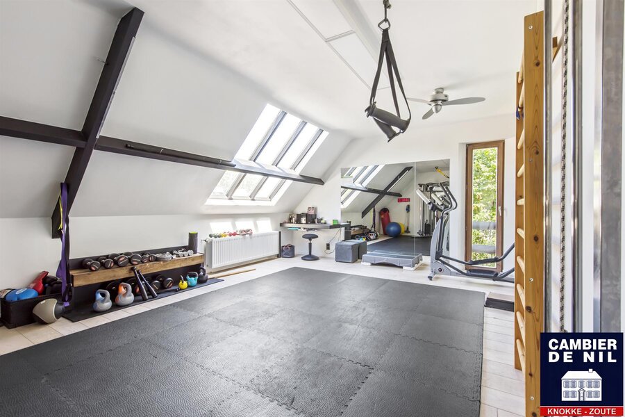 Composition : vaste hall d’entrée avec double hauteur, salle d’attente et toilettes, espace professionnel avec escalier menant à une salle de fitness à l’étage. Accès au grand séjour avec salle à manger et cuisine séparée, tous deux donnant sur le jardin. Grande buanderie avec accès au grenier aménagé en salle TV.