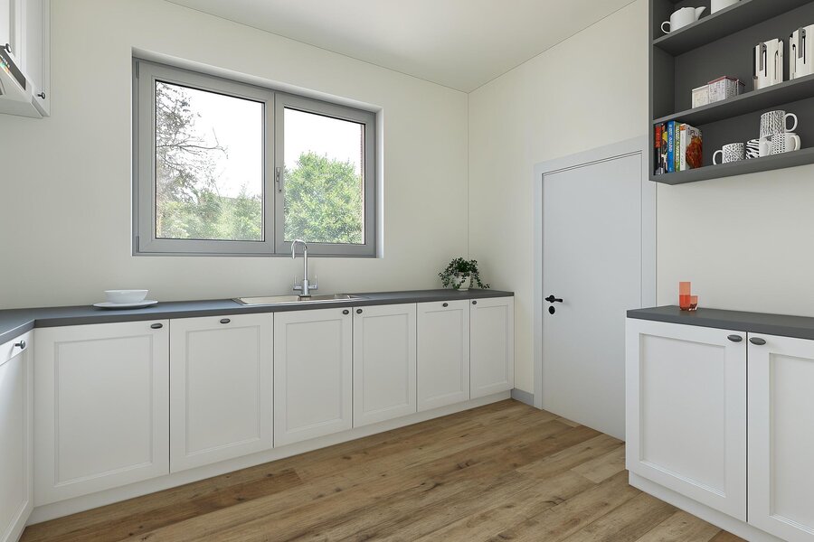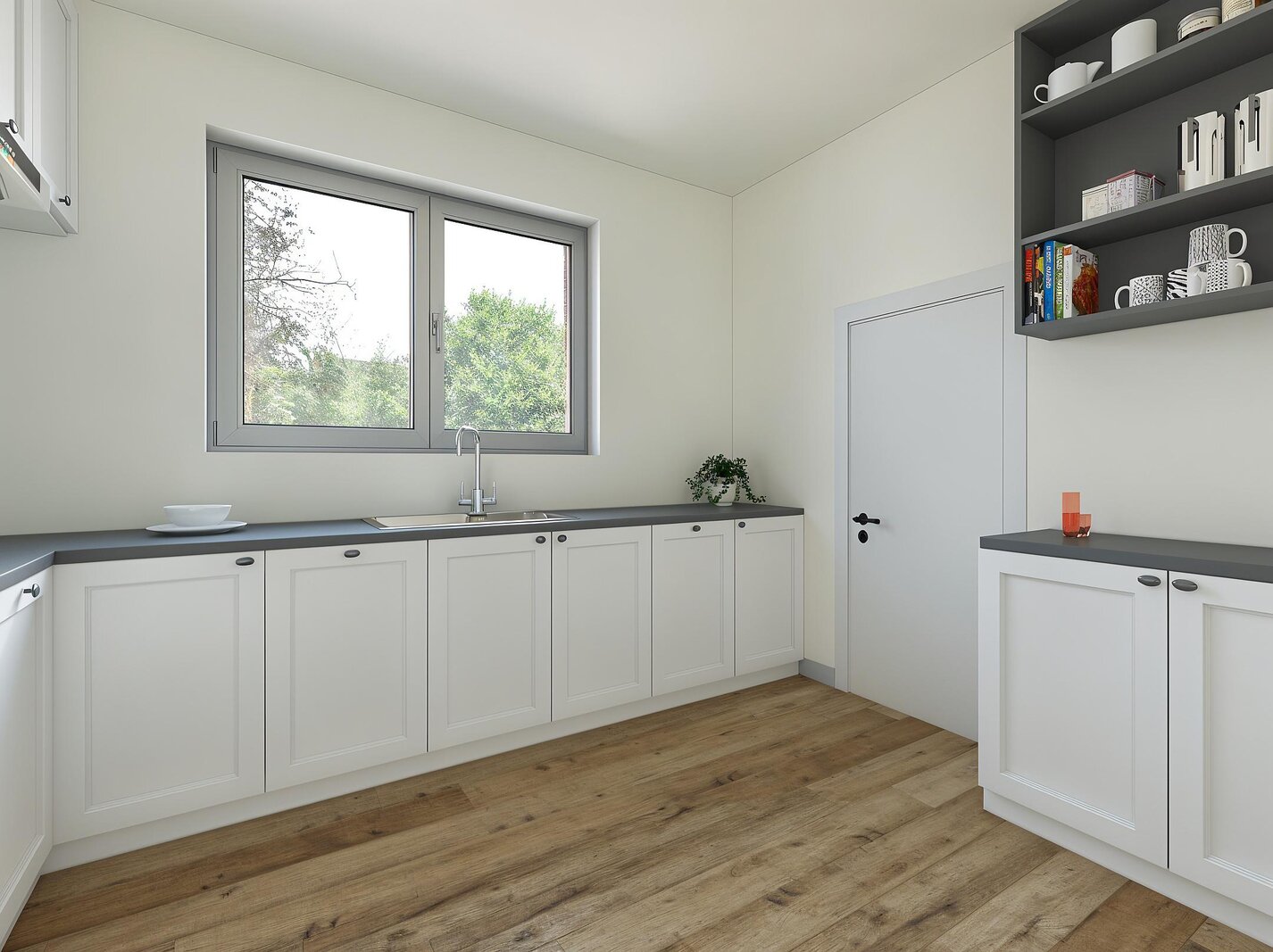 Niv +0: hall d’entrée spacieux, séjour, cuisine, salle à manger, bureau et débarras avec accès à la terrasse et au jardin clôturé.