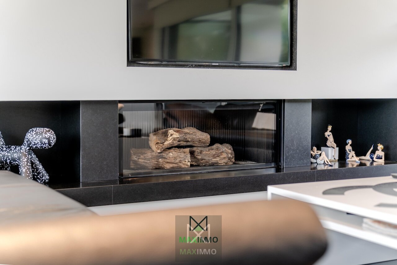 L'espace de vie ouvert offre des vues panoramiques à 180 degrés sur la campagne environnante, avec une cheminée confortable comme élément central. En traversant le salon, vous accédez à la terrasse partiellement couverte, idéalement orientée vers le sud-est. Cette situation garantit un maximum de lumière et d'ensoleillement tout au long de la journée, ce qui permet de profiter de chaque repas ou moment de repos en plein air.