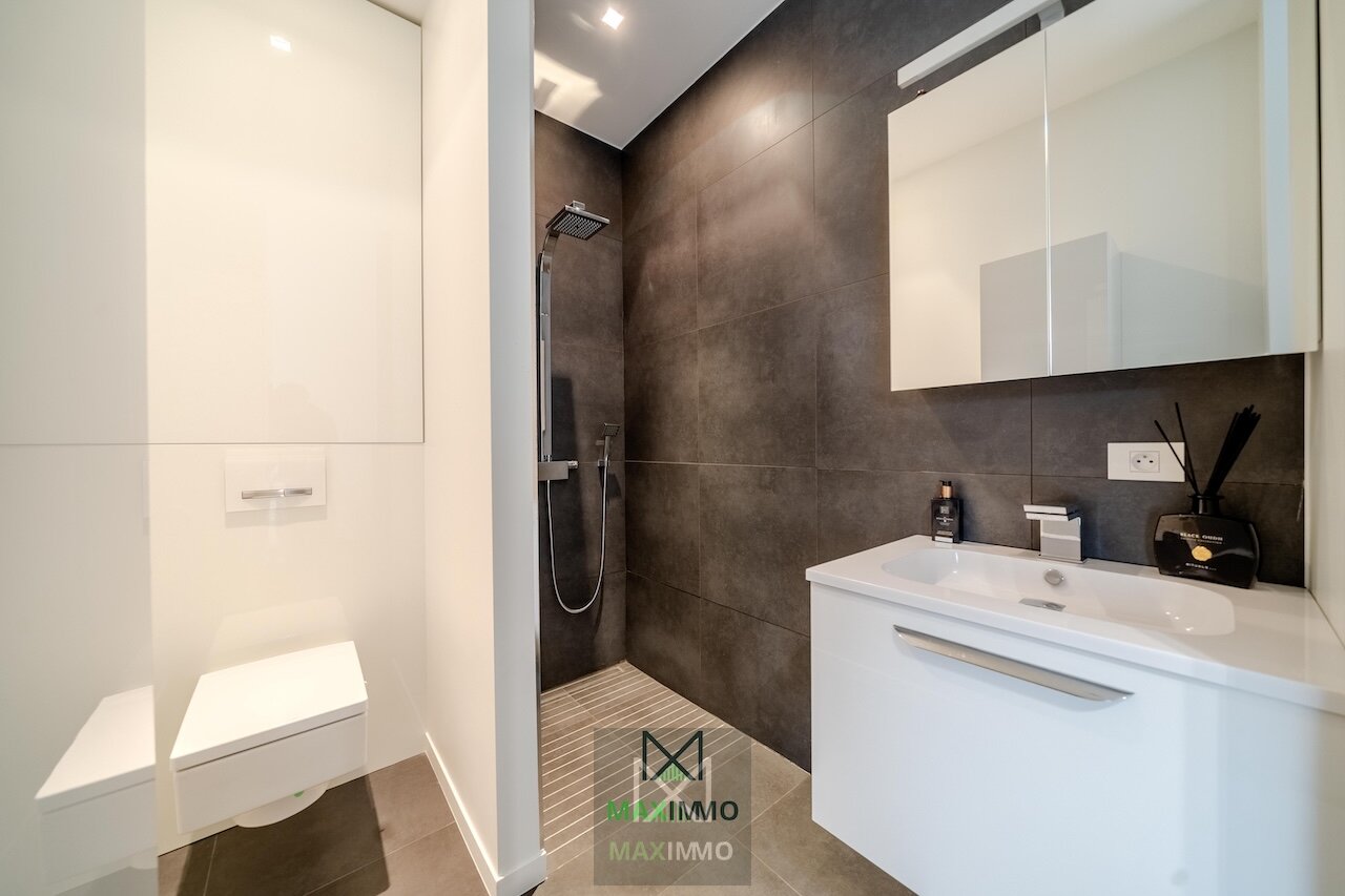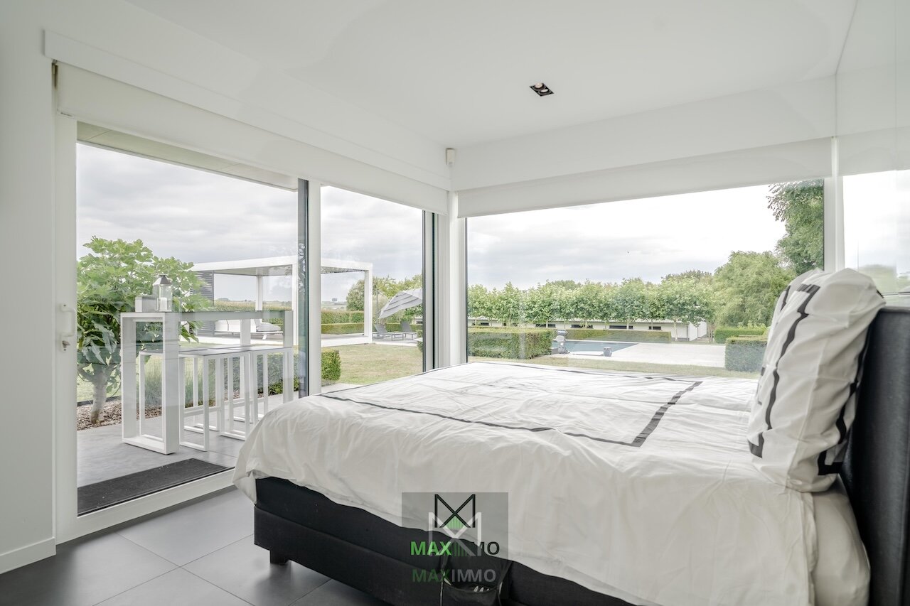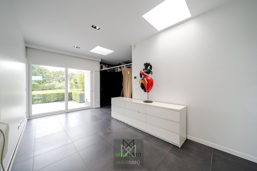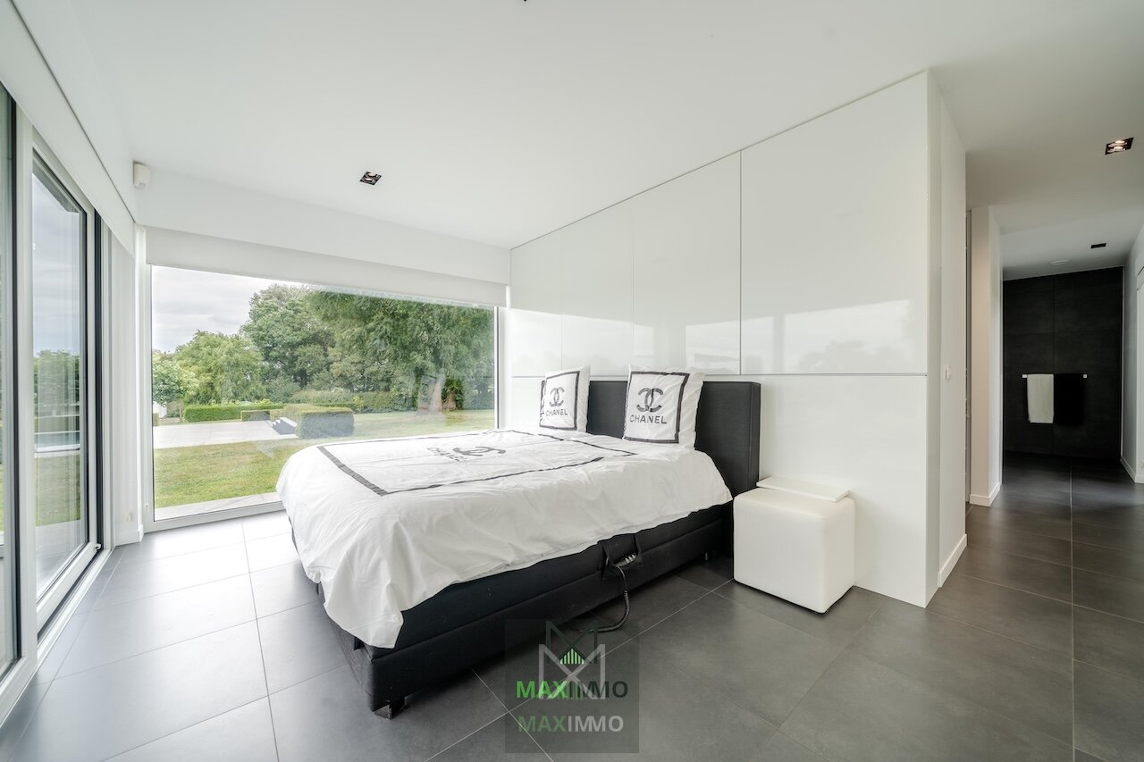 La chambre principale est une oasis de paix et de confort. Grâce à la vue imprenable sur le Kemmelberg et à l'accès direct à une terrasse privée donnant sur la piscine, chaque matin devient une expérience unique. Cette chambre est attenante à une luxueuse salle de bains équipée d'une douche à l'italienne, d'un double lavabo, de toilettes et d'armoires sur mesure, ainsi que d'un spacieux dressing.