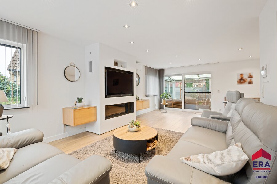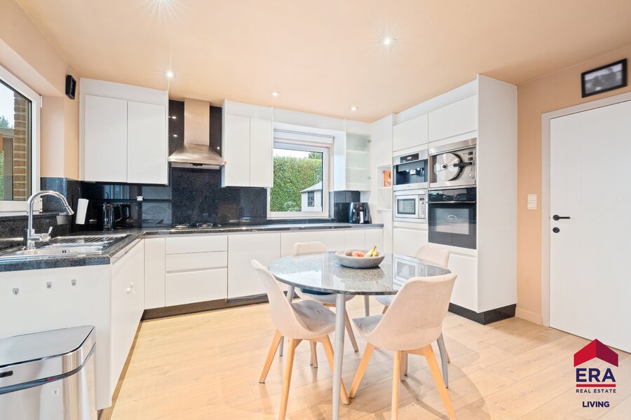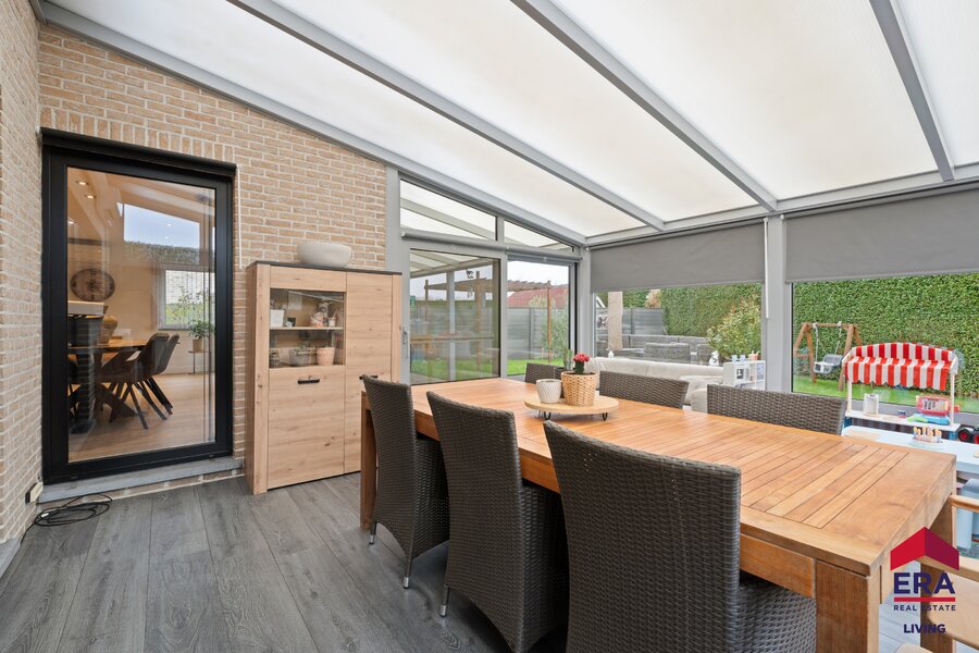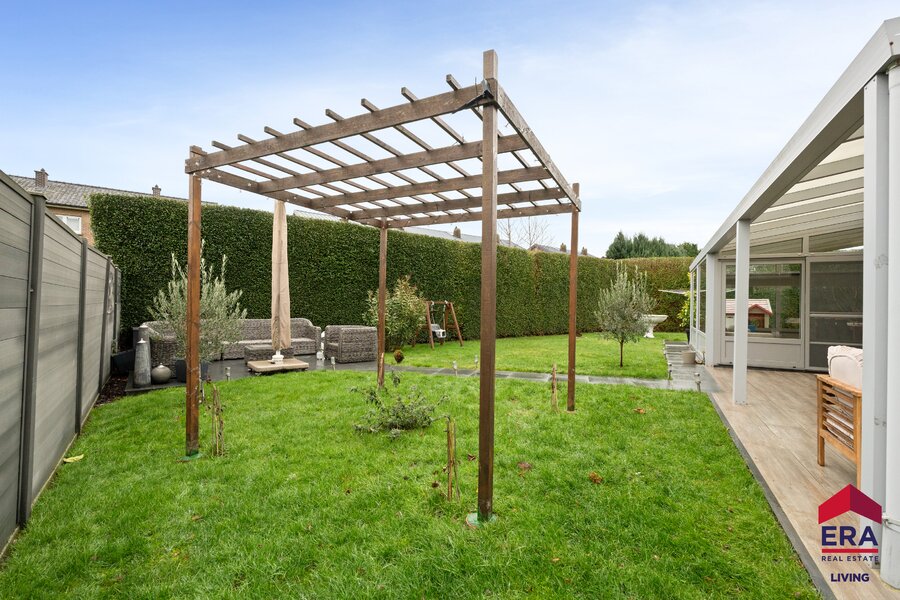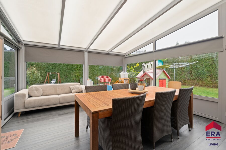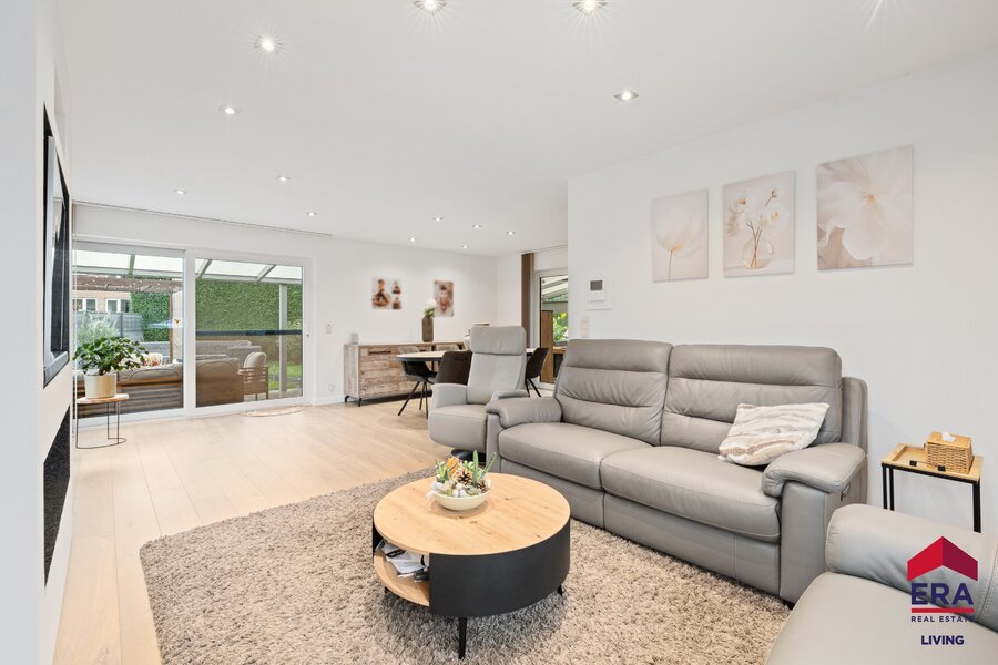 Vous entrez par le hall d’entrée avec WC séparé, qui donne accès à la lumineuse pièce de vie d’environ 40 m². Celle-ci se prolonge par la cuisine entièrement équipée avec lave-vaisselle, taque au gaz, four et micro-ondes. Depuis la cuisine, vous accédez à la véranda climatisée, offrant une vue sur le jardin et un accès direct à celui-ci, avec pergola — un véritable havre de détente. La cuisine donne également accès au garage équipé d’une porte sectionnelle automatique.