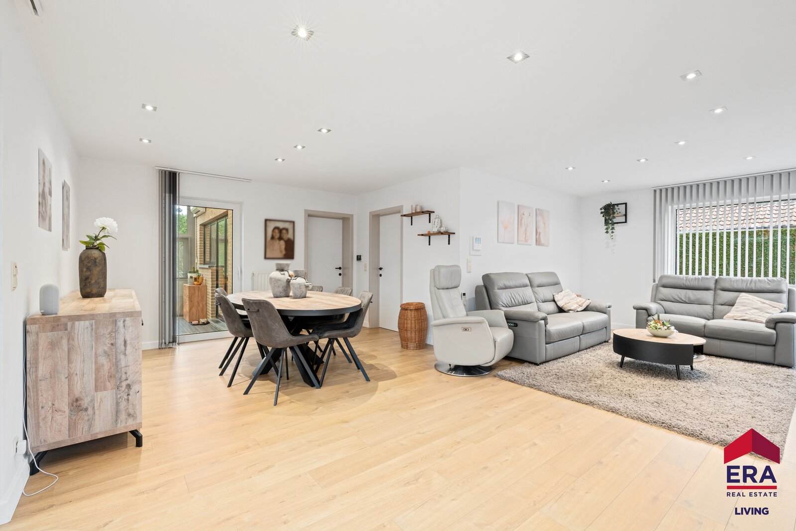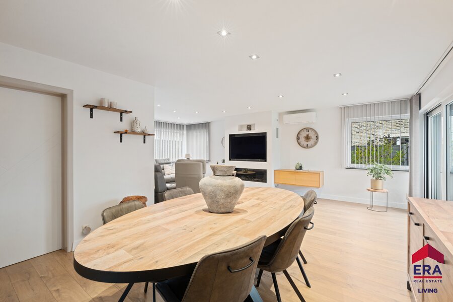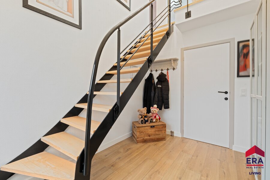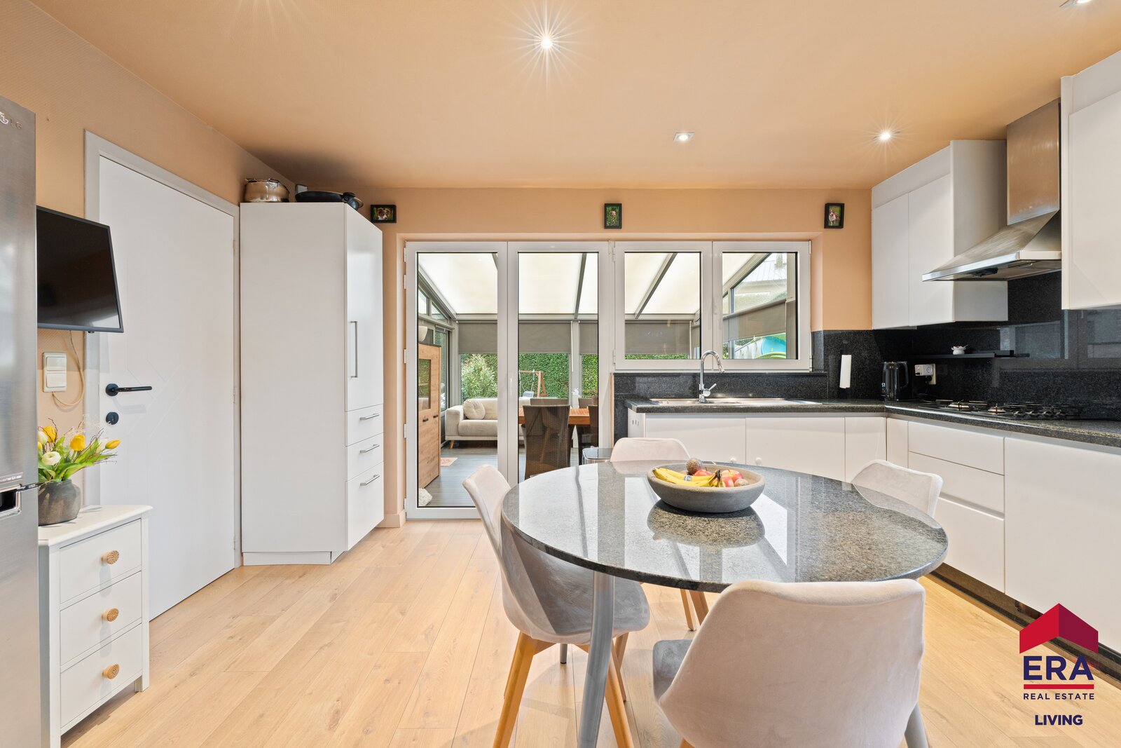 Vous entrez par le hall d’entrée avec WC séparé, qui donne accès à la lumineuse pièce de vie d’environ 40 m². Celle-ci se prolonge par la cuisine entièrement équipée avec lave-vaisselle, taque au gaz, four et micro-ondes. Depuis la cuisine, vous accédez à la véranda climatisée, offrant une vue sur le jardin et un accès direct à celui-ci, avec pergola — un véritable havre de détente. La cuisine donne également accès au garage équipé d’une porte sectionnelle automatique.