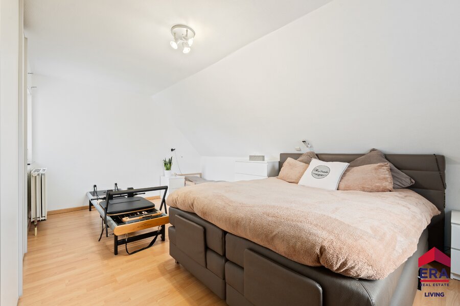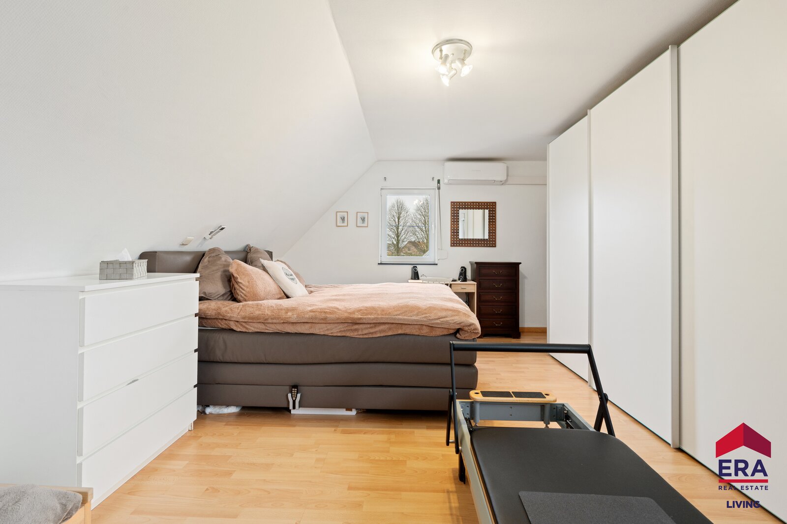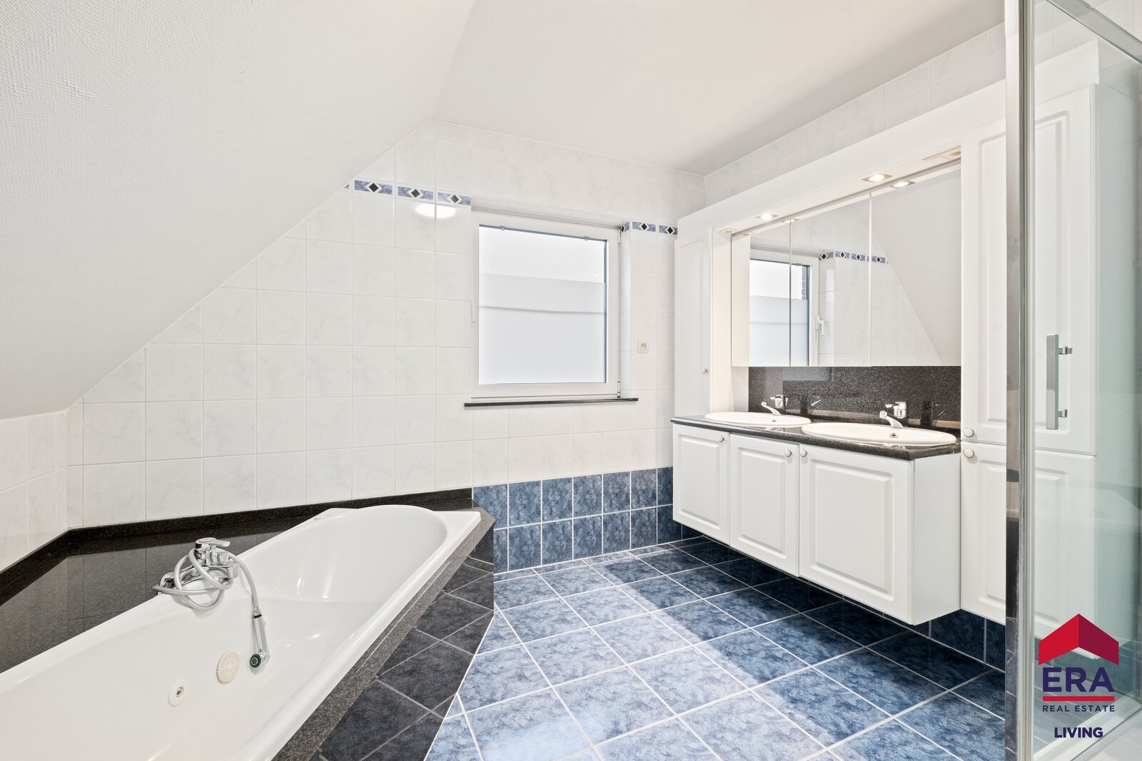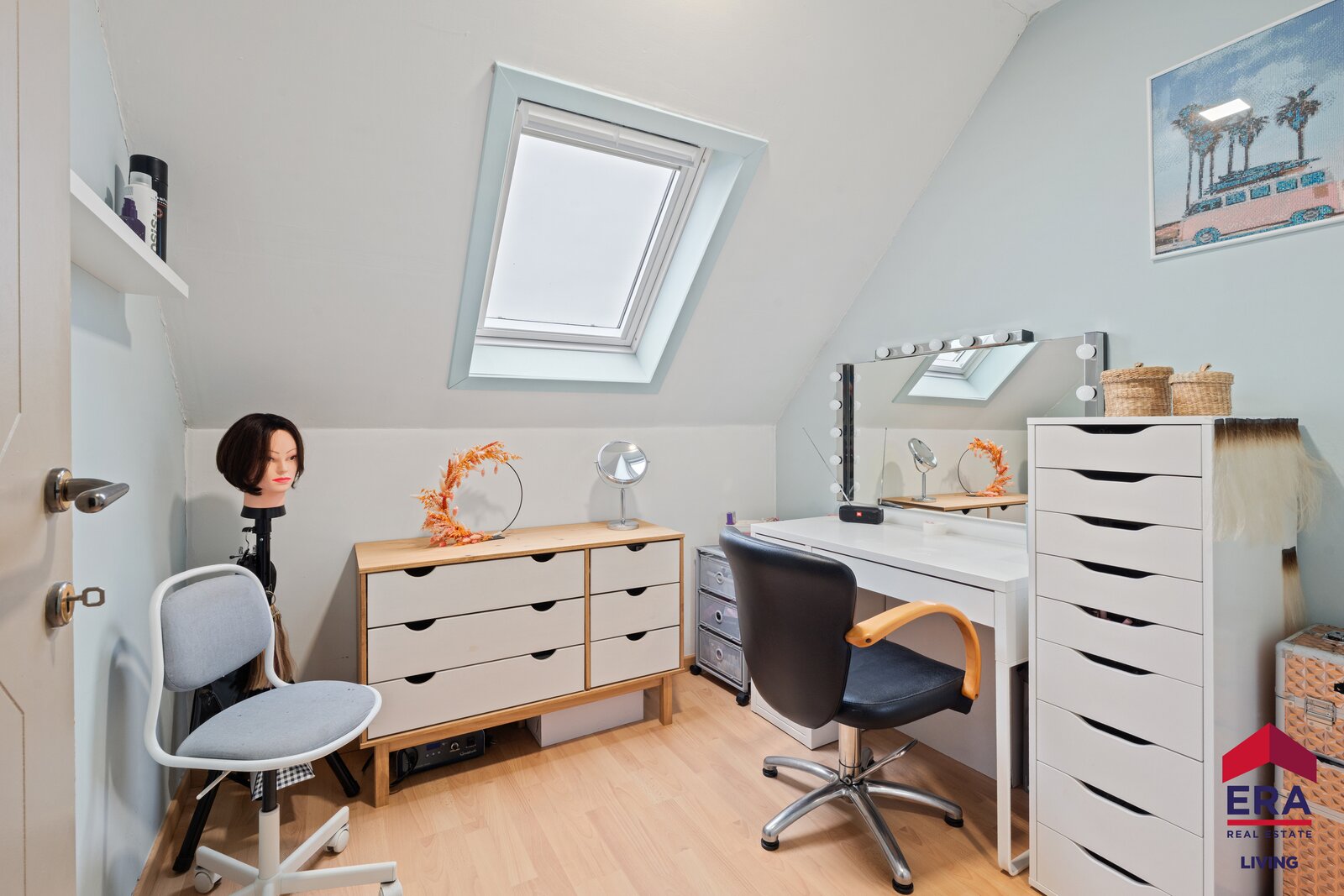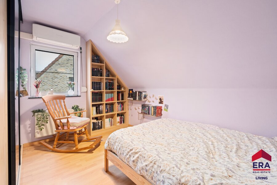 Le hall de nuit mène à trois grandes chambres de respectivement 24, 13 & 11 m², ainsi qu’à une quatrième pièce plus petite, idéale comme bureau, dressing ou chambre d’enfant. La salle de bains est fonctionnelle et dispose d’une baignoire, d’une douche et d’un double lavabo. Enfin, la maison comprend également un grenier de rangement et un abri de jardin.