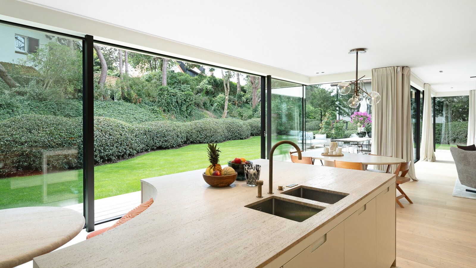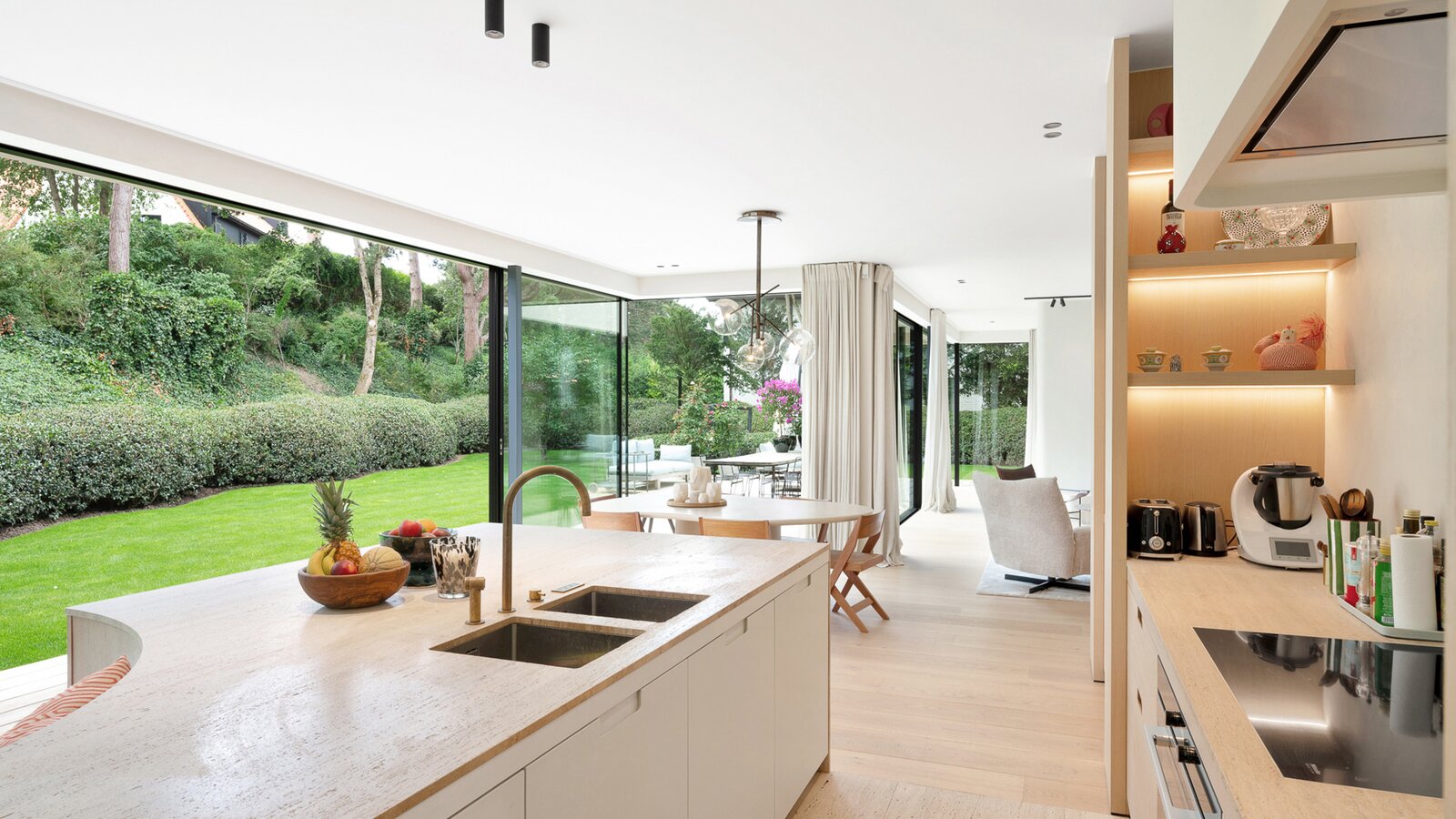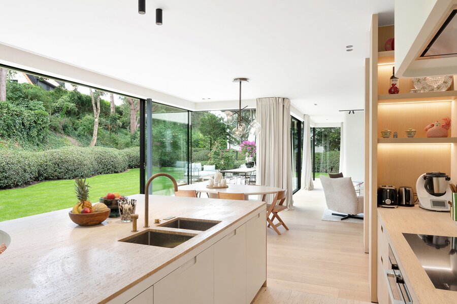 Composition : Grand hall d’entrée avec vestiaire et toilettes. Séjour avec salle à manger. Salle TV/bureau séparée. Cuisine ouverte entièrement équipée avec tous les appareils haut de gamme et un coin déjeuner. Garage double.