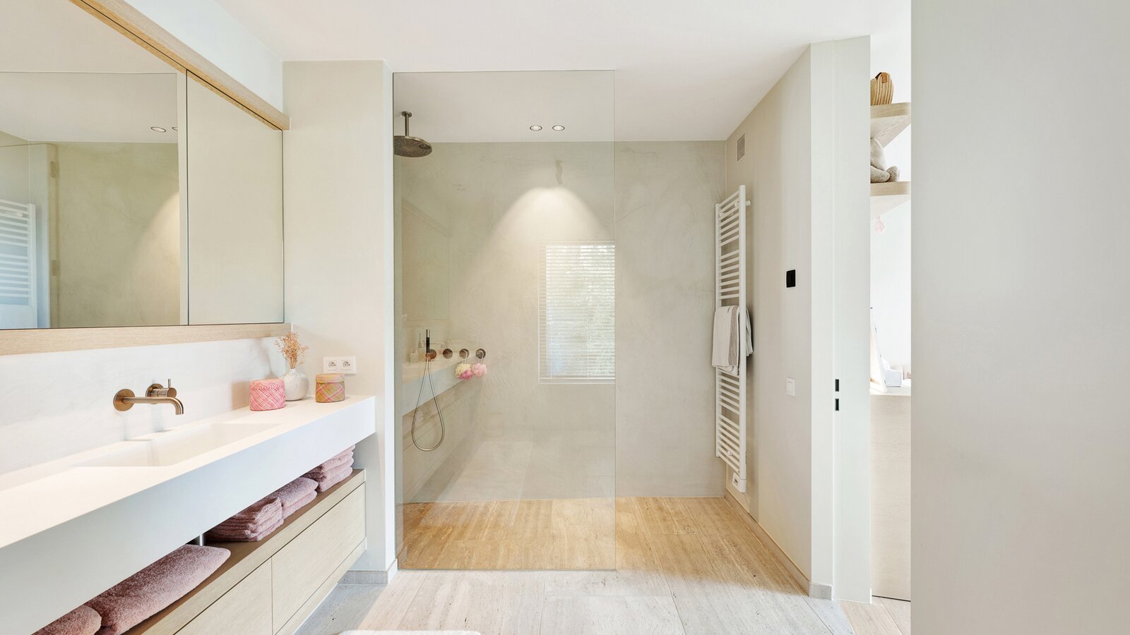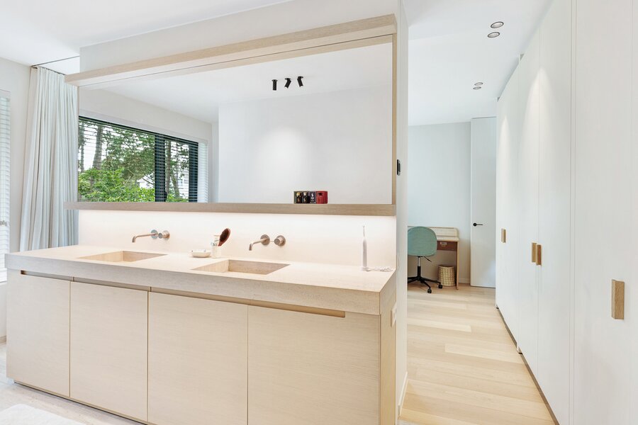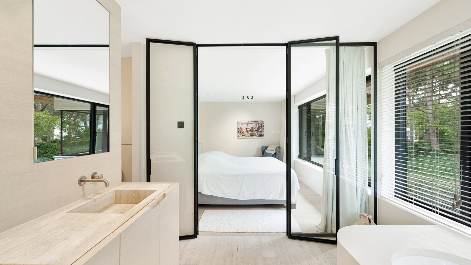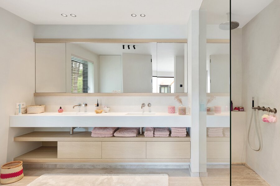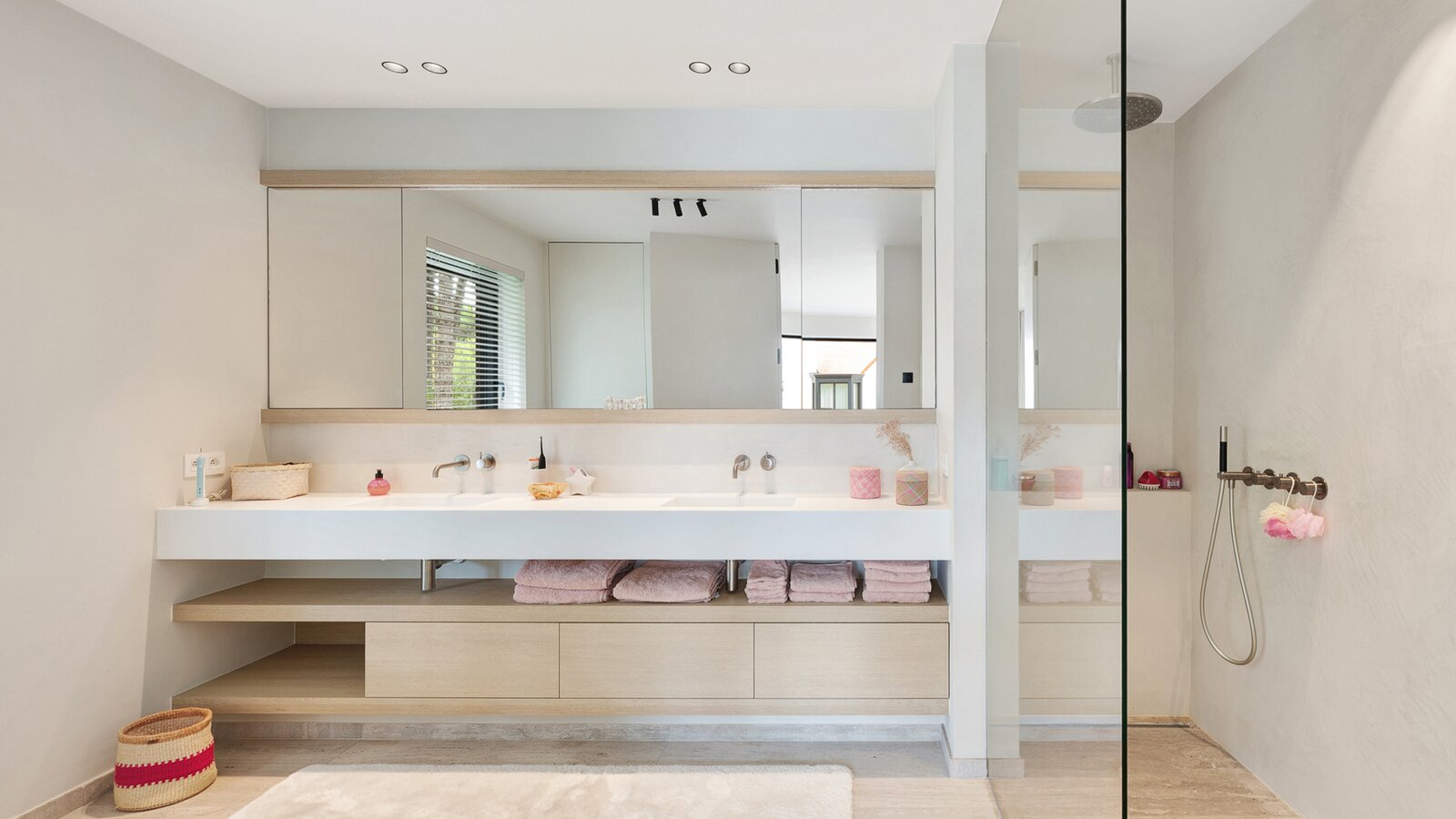 À l’étage : Suite parentale avec dressing et salle de bains luxueuse (baignoire, douche à l’italienne, toilettes et double vasque). Chambre 2 avec placards intégrés et salle de bains spacieuse (douche à l’italienne, double vasque et toilettes). Chambre 3 avec placards intégrés et sa salle de bain (double vasque, douche à l’italienne et toilettes).