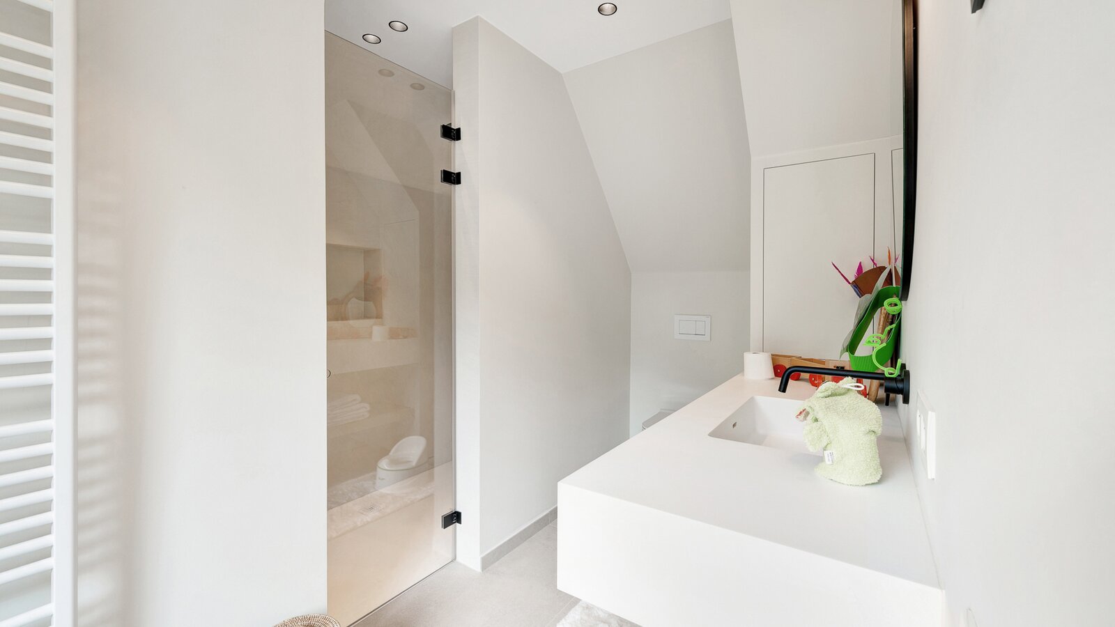 Deuxième étage : Chambre 4 avec placards intégrés et salle de bain (douche à l’italienne, toilettes, lavabo).