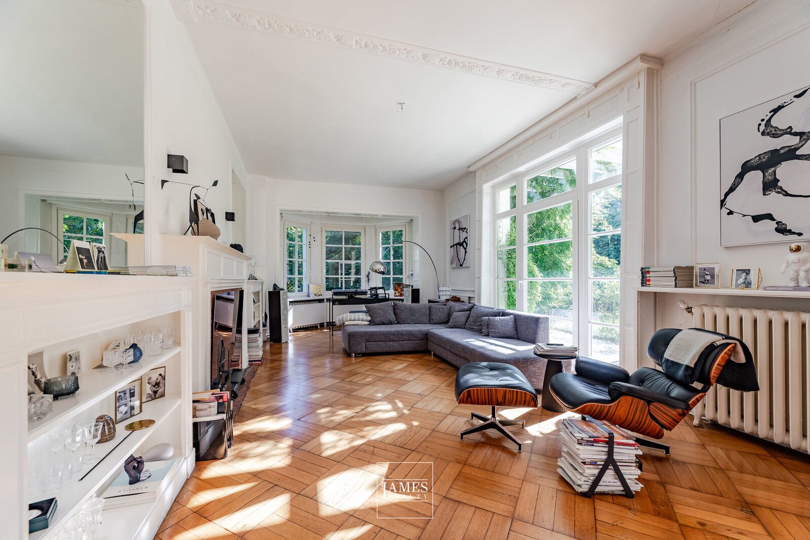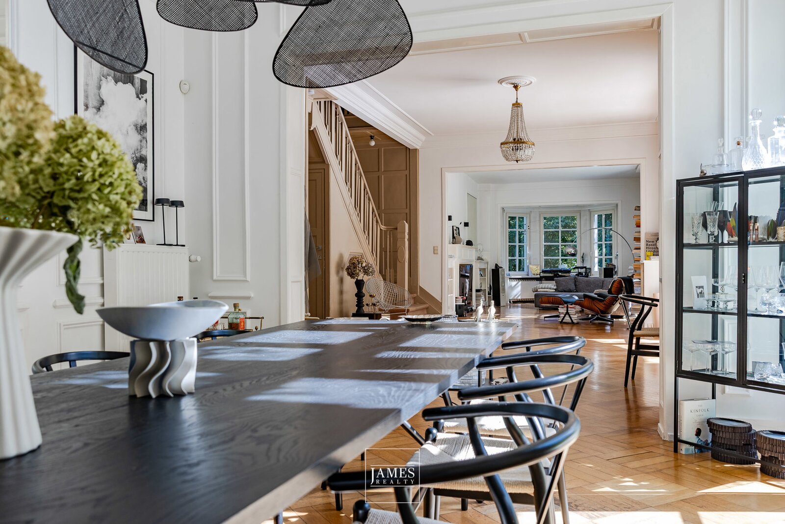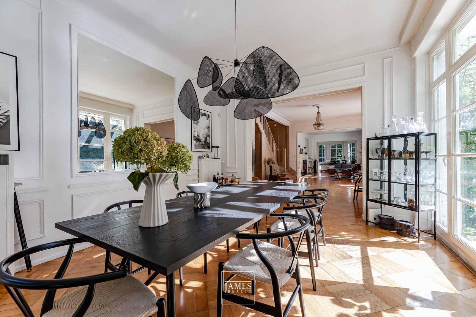 Actuellement organisée sur trois niveaux, la maison présente un charmant décor d’époque (parquets, volumes classiques) et un programme familial complet. Le rez-de-chaussée propose de lumineuses réceptions ouvertes sur la terrasse et le jardin, un bureau et une cuisine séparée. Les étages accueillent plusieurs chambres et salles d’eau, tandis que le demi-sous-sol comprend caves et locaux techniques. Un double garage indépendant et de nombreux parkings extérieurs complètent l’ensemble.