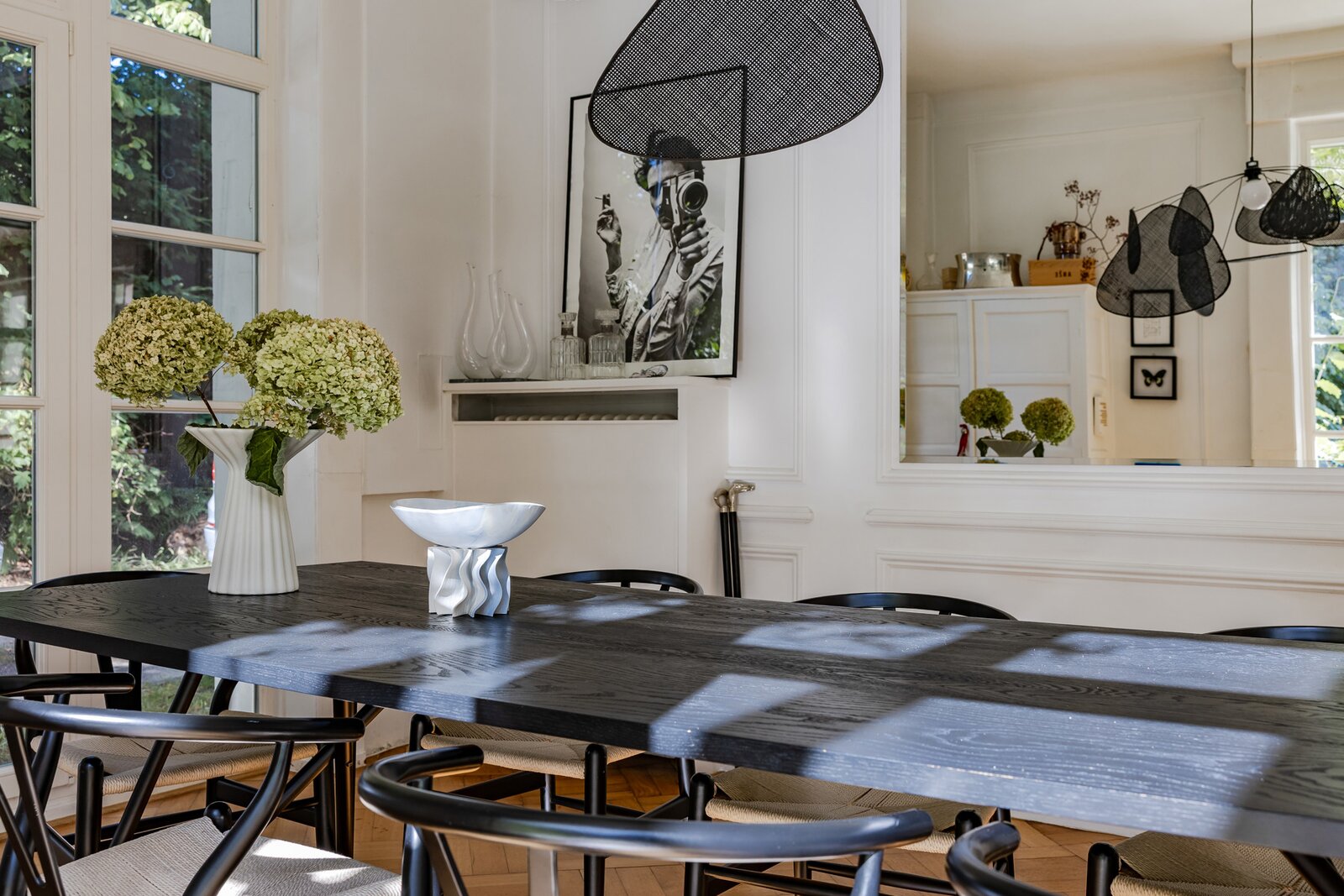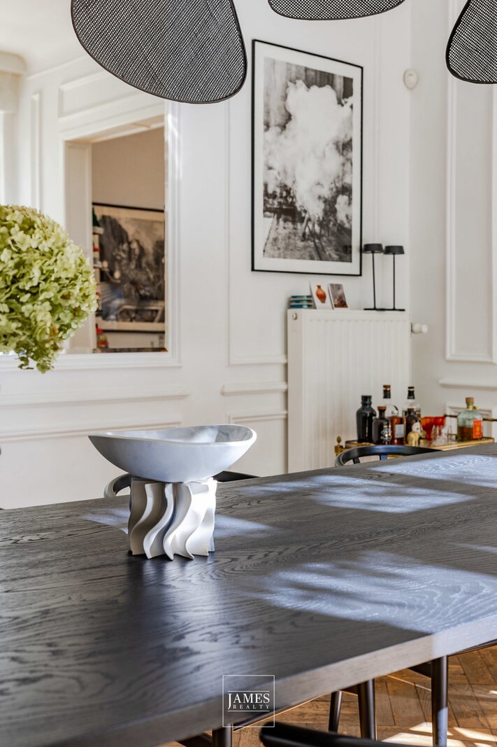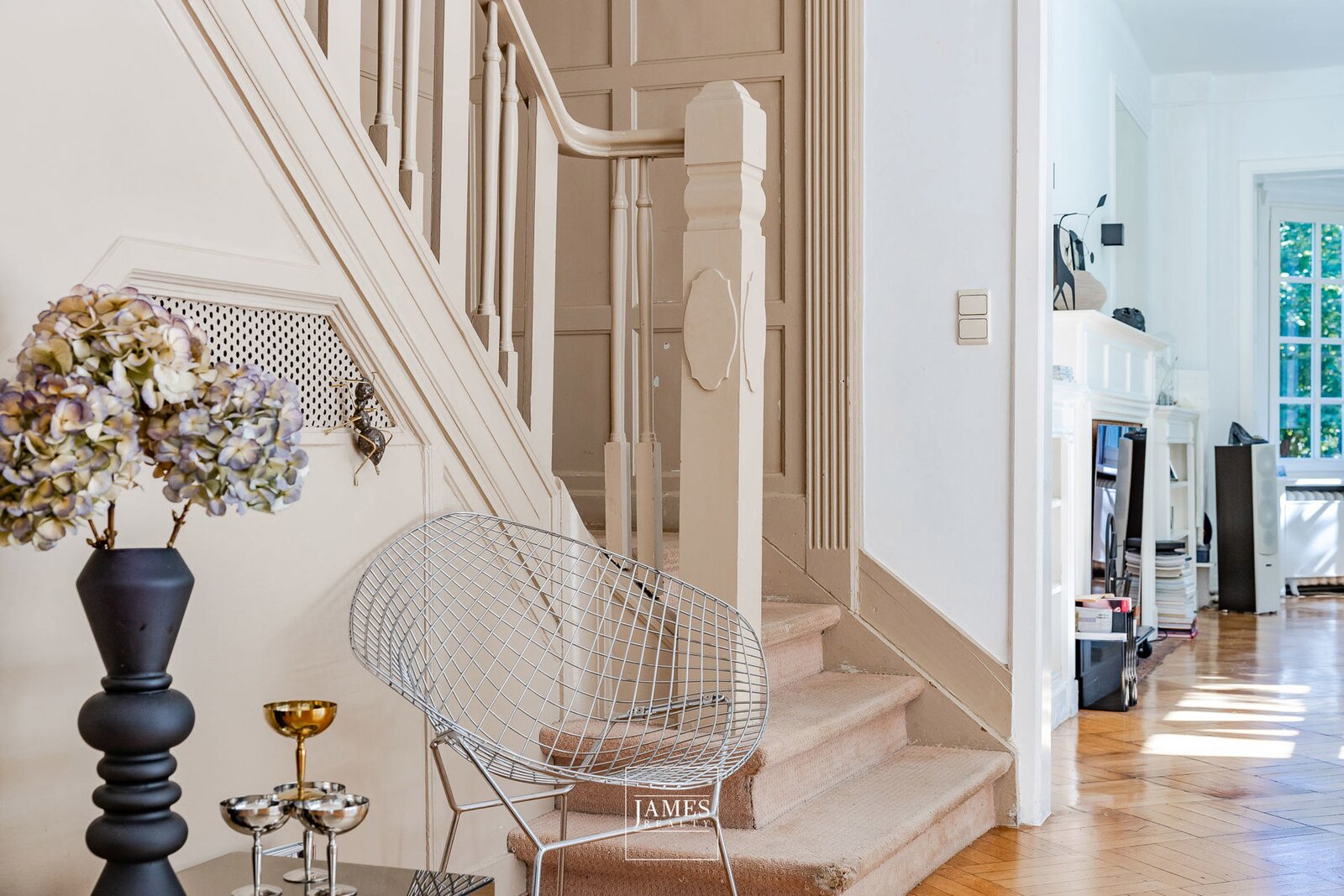 Actuellement organisée sur trois niveaux, la maison présente un charmant décor d’époque (parquets, volumes classiques) et un programme familial complet. Le rez-de-chaussée propose de lumineuses réceptions ouvertes sur la terrasse et le jardin, un bureau et une cuisine séparée. Les étages accueillent plusieurs chambres et salles d’eau, tandis que le demi-sous-sol comprend caves et locaux techniques. Un double garage indépendant et de nombreux parkings extérieurs complètent l’ensemble.