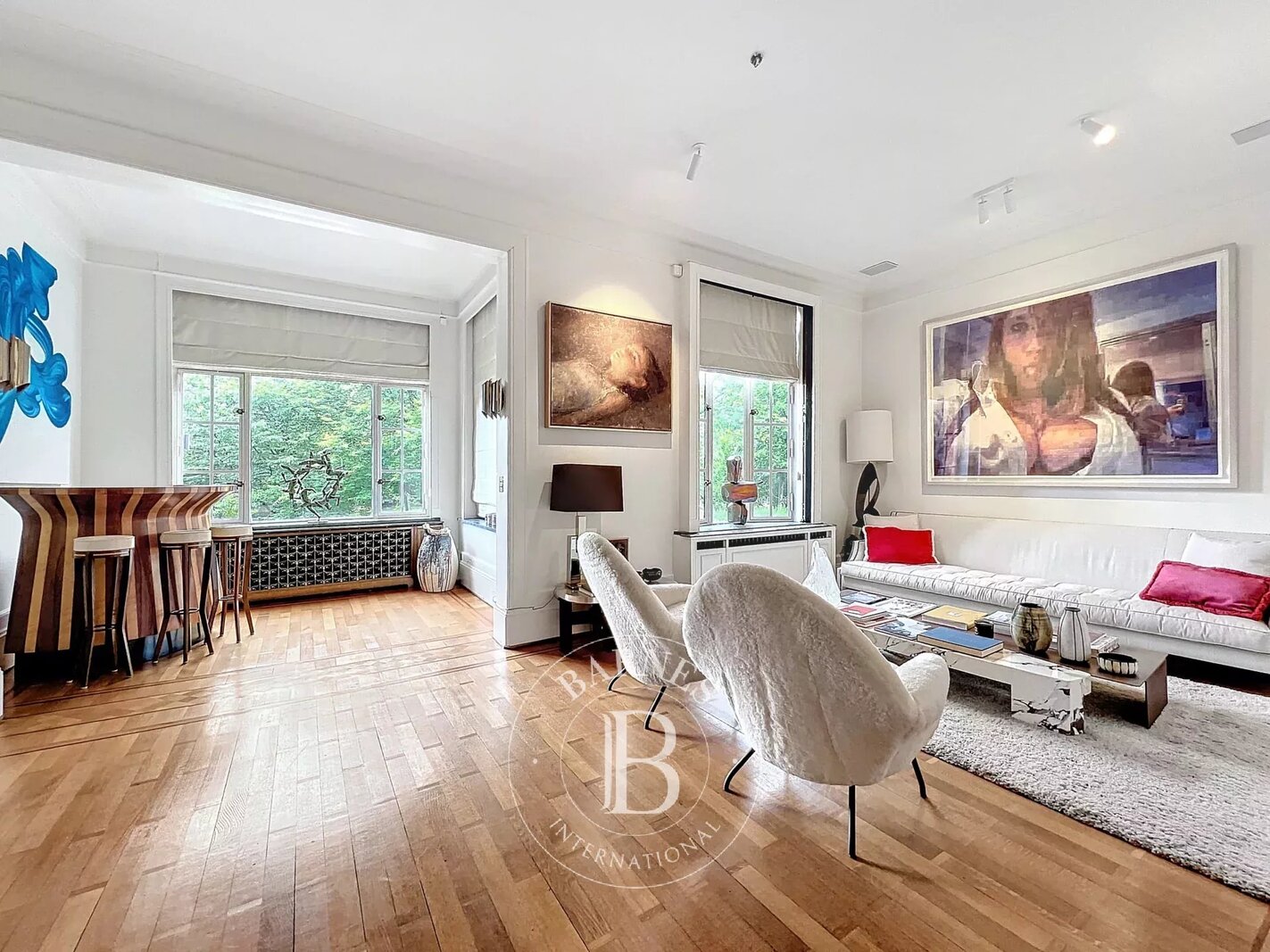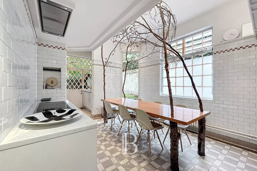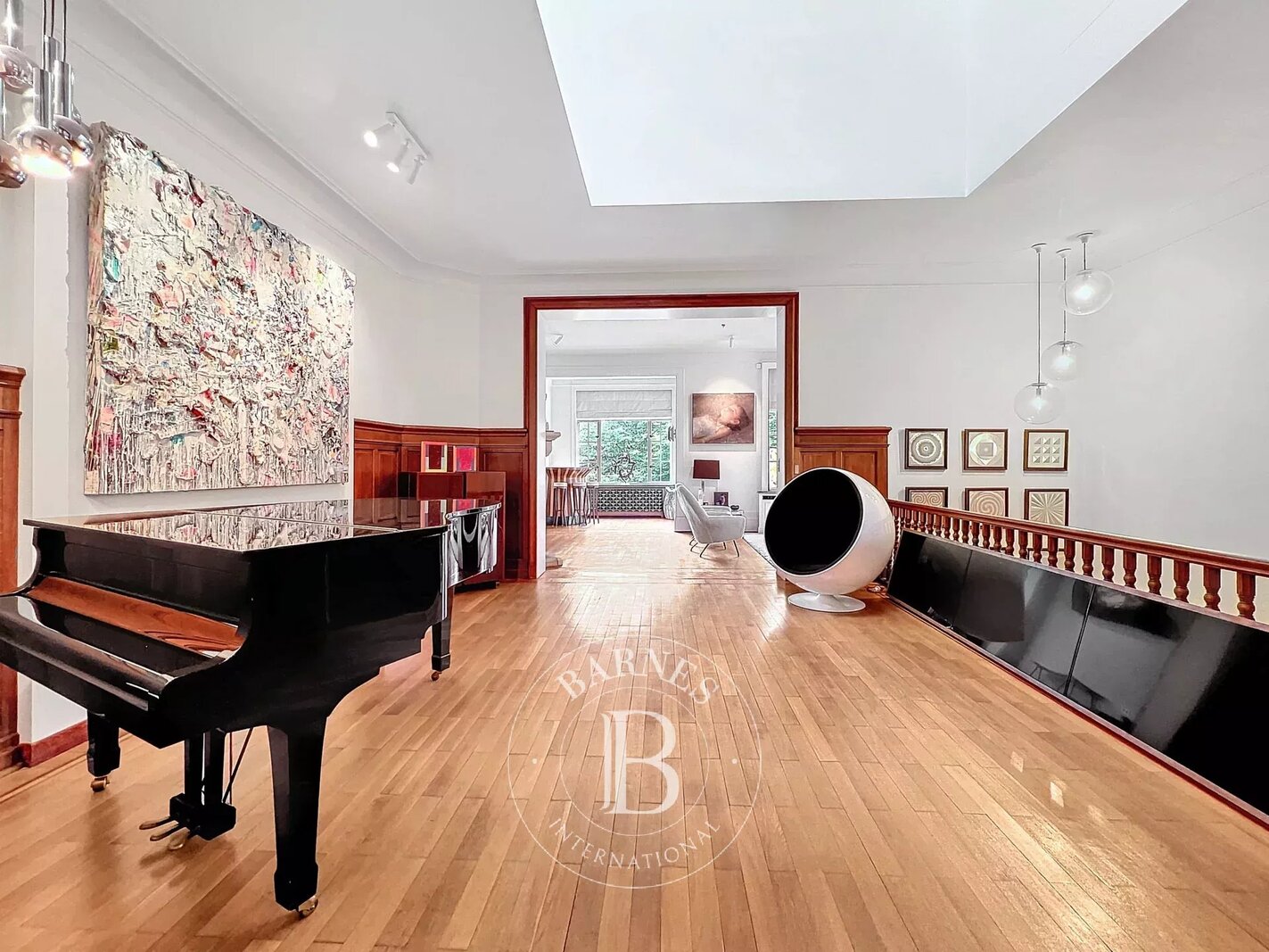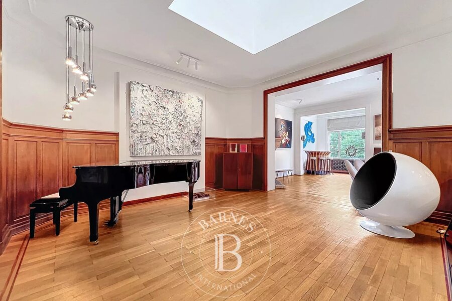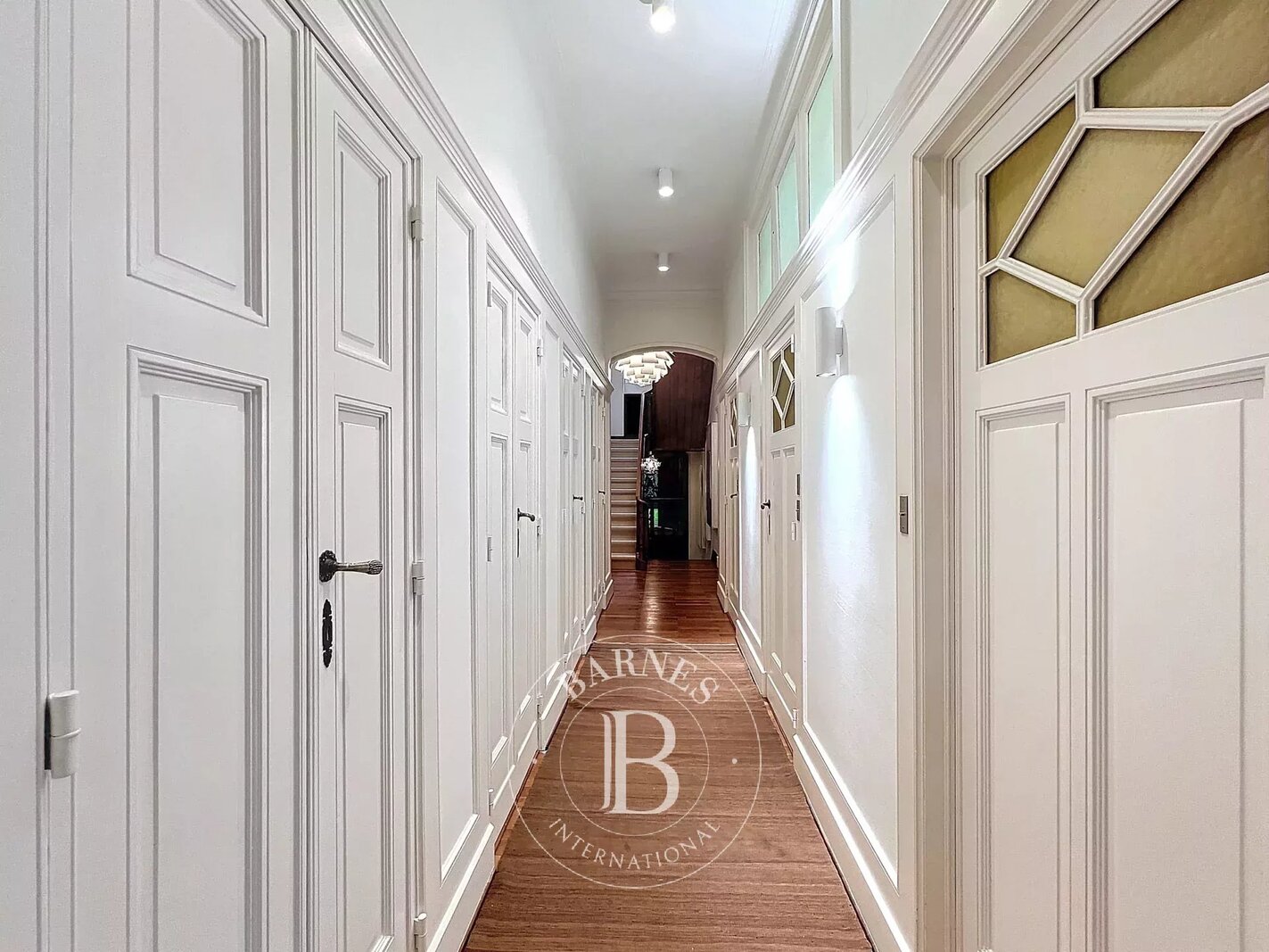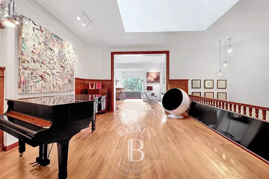 Au bel étage : spectaculaires pièces de réception, salle à manger séparée, cuisine entièrement équipée et indépendante avec office, terrasse et jardin paysagé.