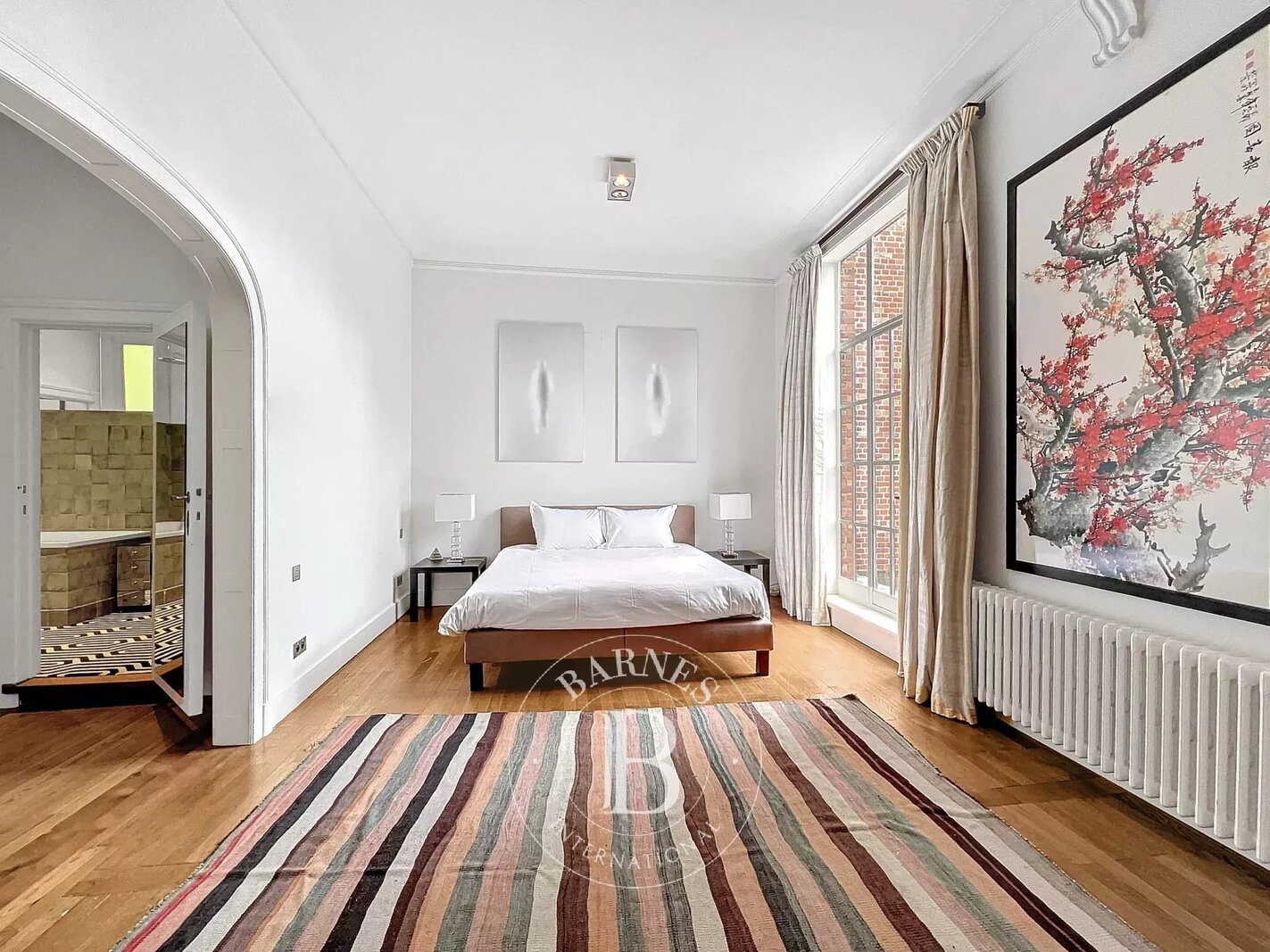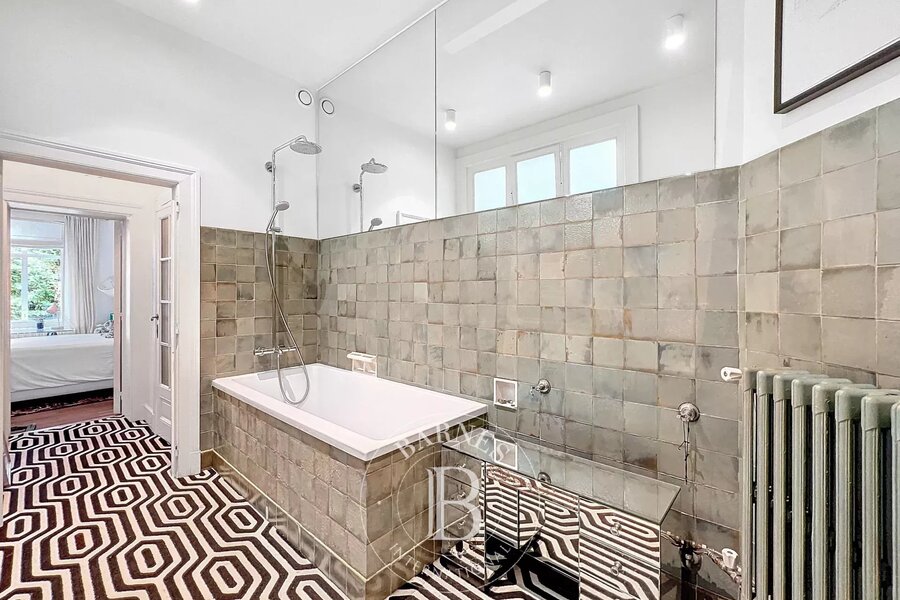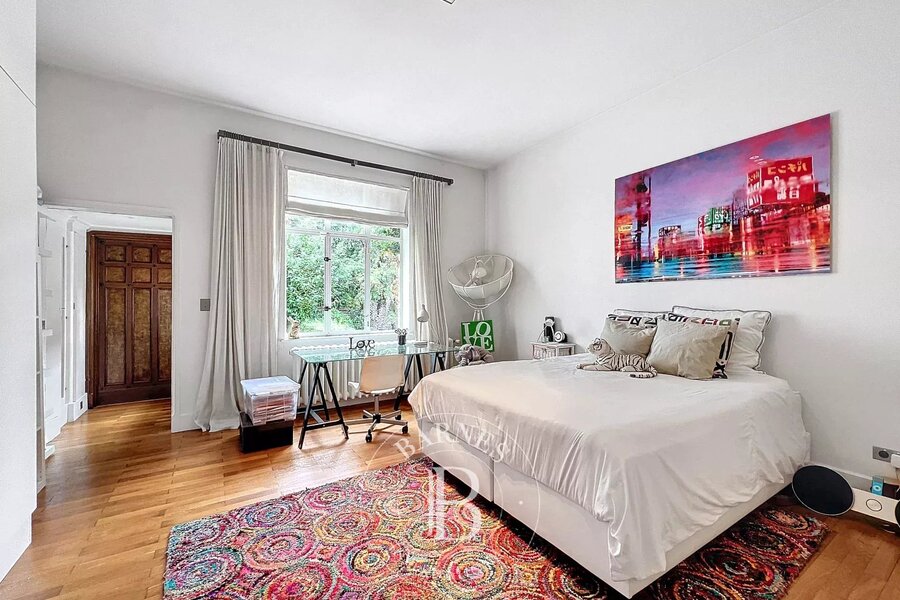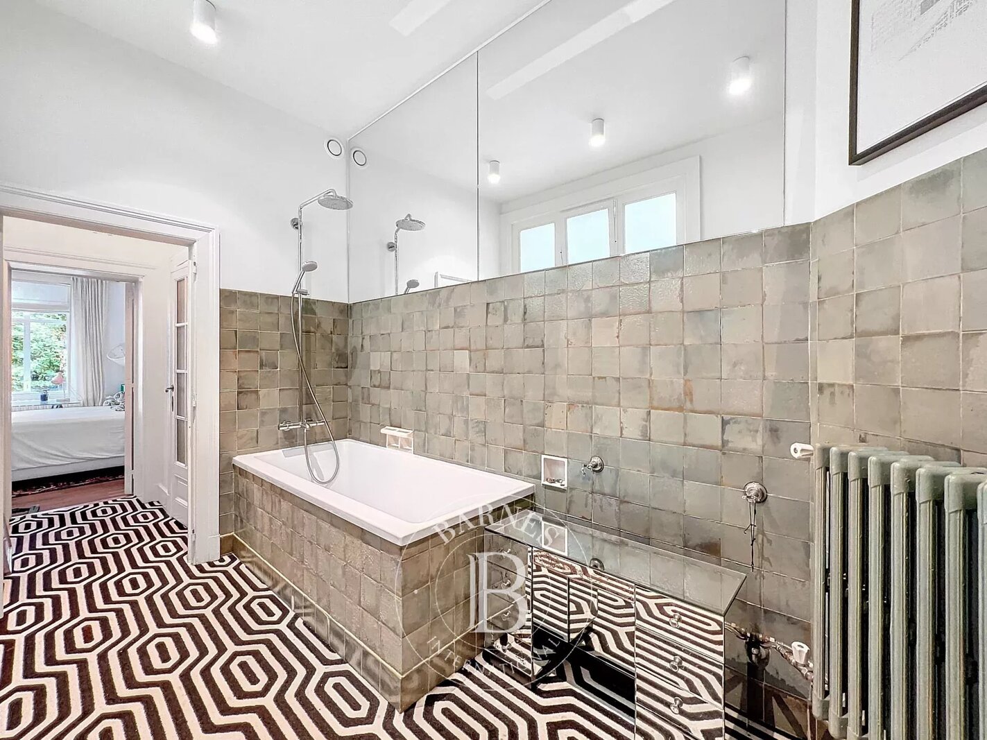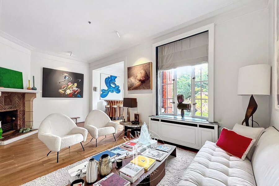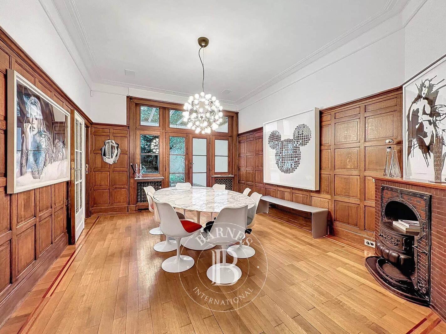 Au bel étage : spectaculaires pièces de réception, salle à manger séparée, cuisine entièrement équipée et indépendante avec office, terrasse et jardin paysagé.