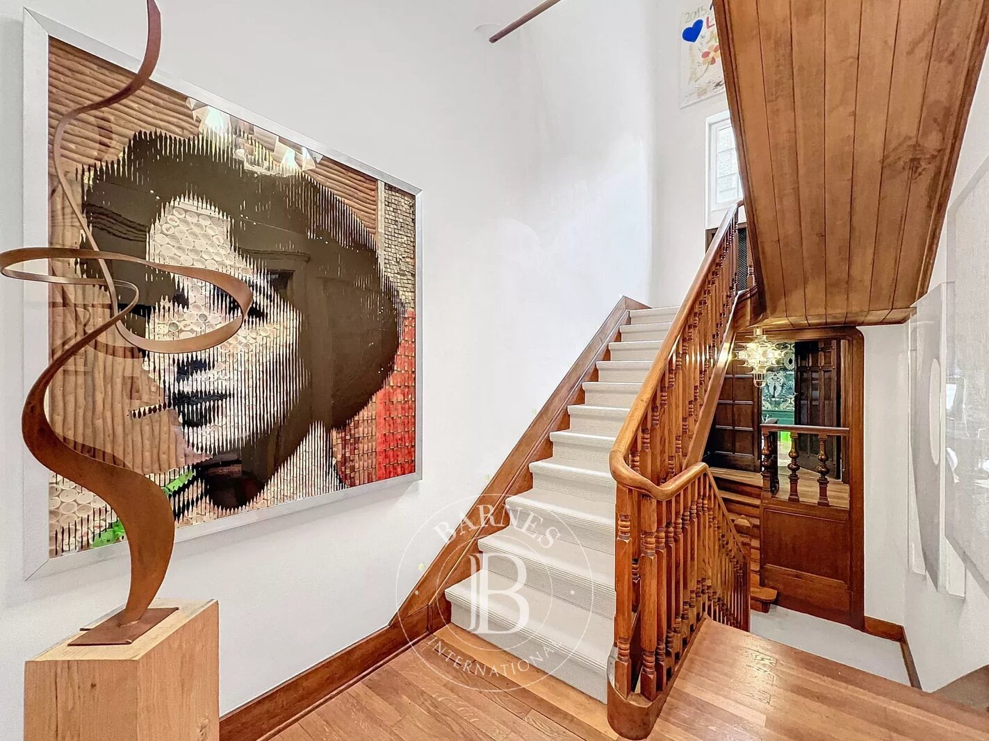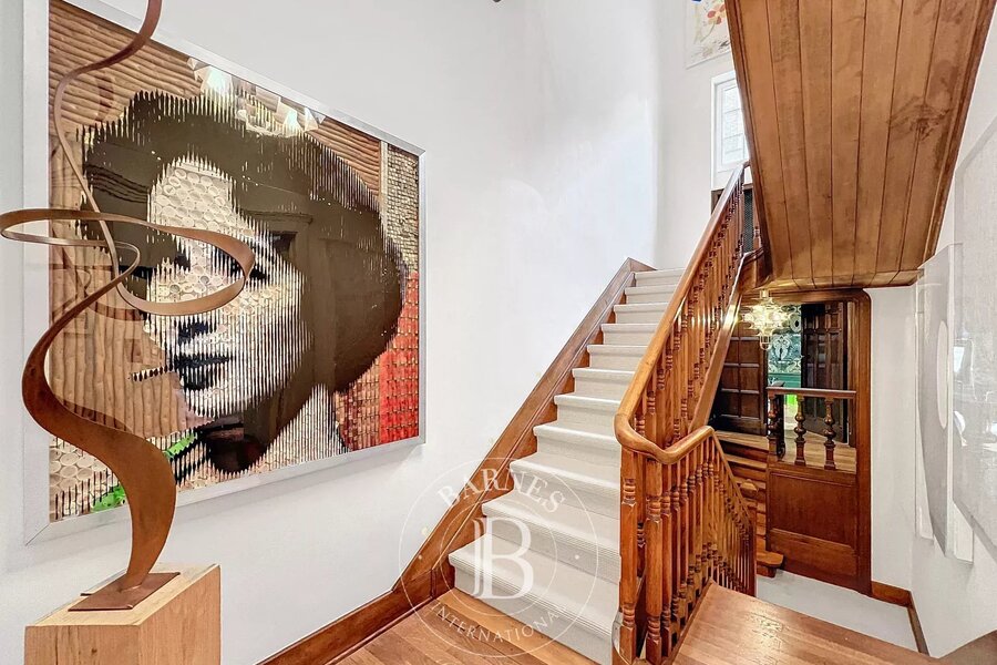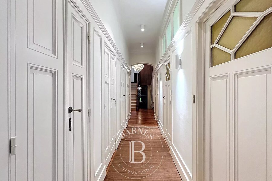Au rez-de-chaussée : un hall d'entrée, un vestiaire, des toilettes invités, une magnifique cage d'escalier, une buanderie, un escalier de service, un local technique, une cave à vin, un garage.