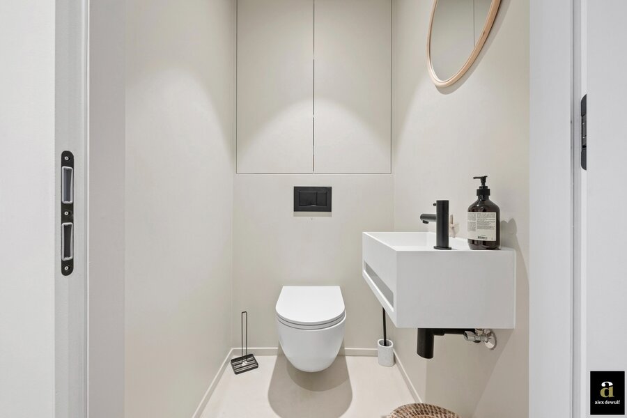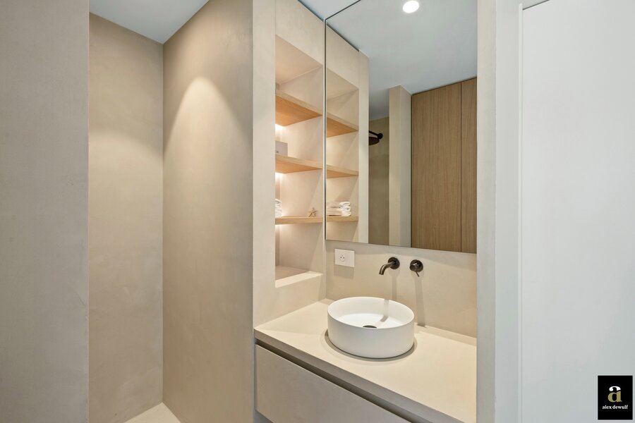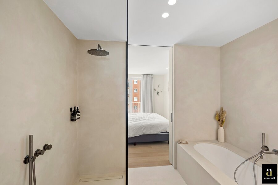 La chambre principale dispose d'une salle de bains attenante avec une baignoire, une douche à l'italienne en mortex et un meuble lavabo, ainsi que d'armoires supplémentaires encastrées (dressing). La deuxième chambre dispose également d'une salle de douche spacieuse.