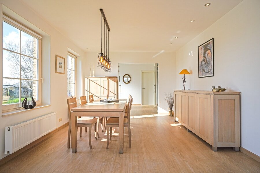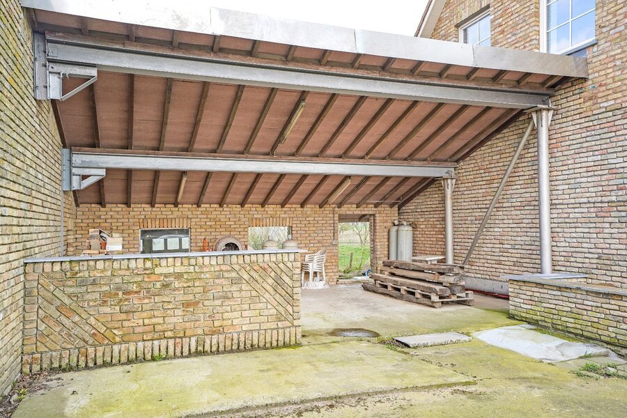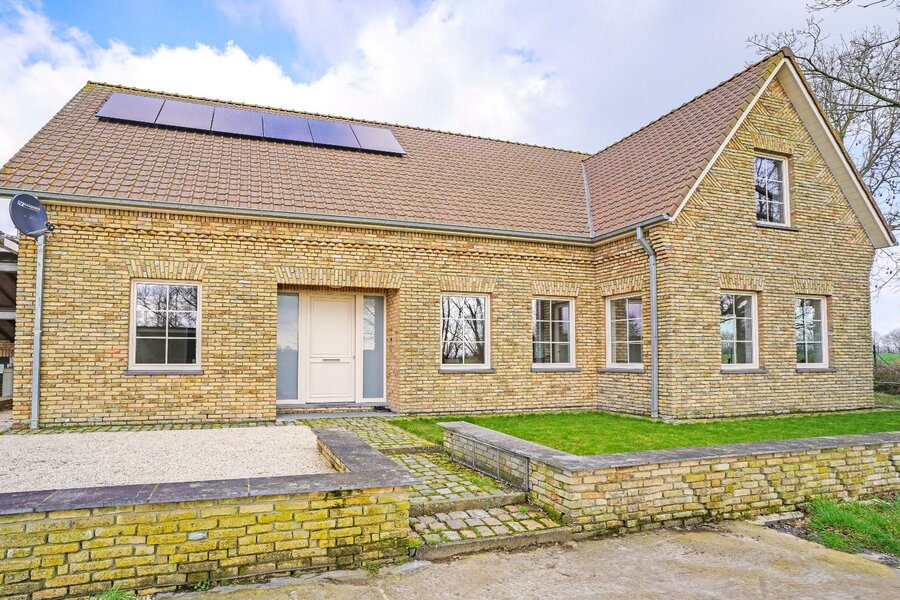 Recente open bebouwing (2019) op een perceel van maar liefst +- 8000 m², rustig en landelijk gelegen in Houtem vlakbij de kust. Deze energiezuinige eigendom (EPC label A) combineert hedendaags wooncomfort met ruimte, privacy en tal van mogelijkheden voor paardenliefhebbers, zelfstandigen of hobbyisten. Op het gelijkvloers betreedt u de woning via de inkomhal. De lichtrijke leefruimte met vele raampartijen zorgt voor een aangename verbinding met de tuin. Aansluitend bevindt zich de volledig uitgeruste keuken met tegelvloer en kwalitatieve toestellen. Verder is er een praktische berging/technische ruimte. Er zijn twee badkamers: één met hangtoilet, lavabo en douche. De slaapkamer op het gelijkvloers vormt een comfortabele privésuite met dressing en een ensuite badkamer voorzien van dubbel lavabomeubel en inloopdouche. De eerste verdieping bestaat uit een ruime zolder waar eenvoudig extra slaapkamers en een bijkomende badkamer kunnen worden ingericht. Een uitgewerkt plan met twee slaapkamers, badkamer, berging en extra zolderruimte is beschikbaar. Qua technieken is het geheel uitgerust met centrale verwarming, een warmtepompboiler, houtkachel, ventilatiesysteem D, 6 zonnepanelen en twee regenwaterputten van elk 7.500 liter. PVC-ramen met hoogrendementsbeglazing en het zadeldak dragen bij aan het energiezuinige karakter. Buiten geniet u van een tuin rondom het huis, een ruime weide en een laag- en hoogstamboomgaard. Daarnaast beschikt de eigendom over een loods van 320 m² met 5 paardenboxen en opslagruimte, evenals een carport van 40 m² voor het overdekt plaatsen van wagen(s).