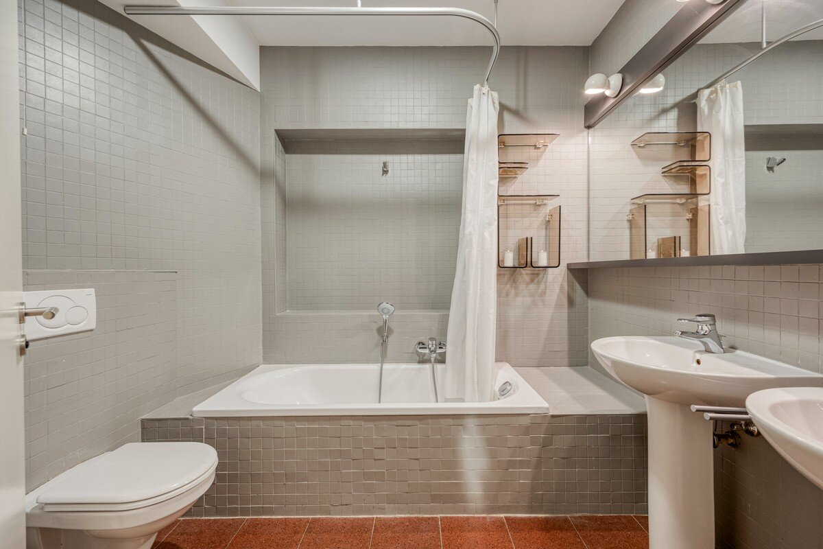 Een hal leidt naar het centrale patio-terras van 30 m² waar kan genoten worden van een rustig moment in de stad met zicht op de toren van het iconische Belfort. Het appartement beschikt over drie slaapkamers, momenteel ingericht als master bedroom met aansluitend een royaal bureau met ingebouwde bergkast en annex badkamer met douche en toilet. Een tweede badkamer met ligbad (en aansluitingen wasmachine) bevindt zich naast de derde kamer. net als een afzonderlijk gastentoilet.