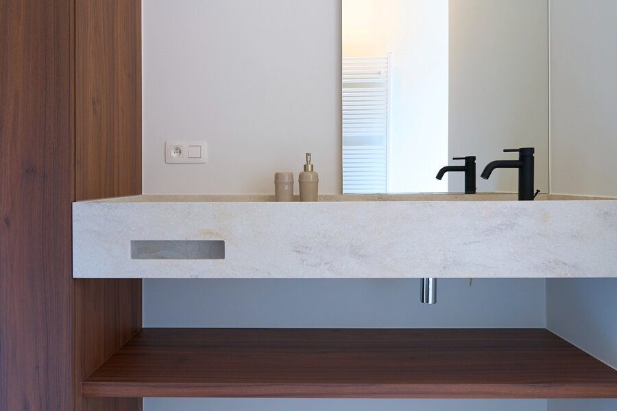 Tweede ruime slaapkamer, tweede luxe badkamer met douche, ligbad, toilet en dubbele wastafel.
