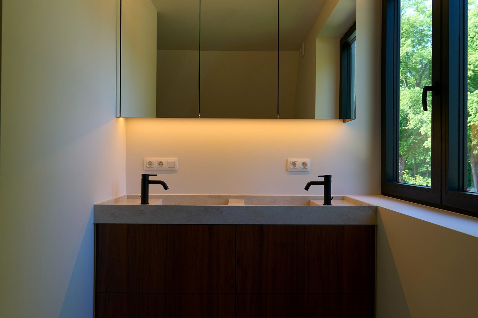 Indeling eerste verdieping: overloop met de ouderslaapkamer en aanpalende mooie douchekamer met toilet en dubbele wastafel in een strak meubel en luxe inloopdouche,