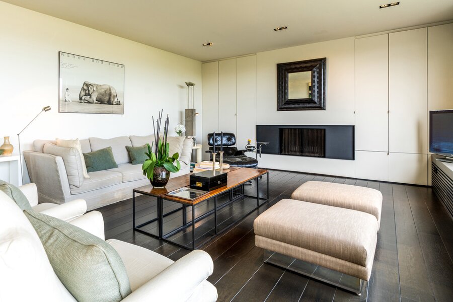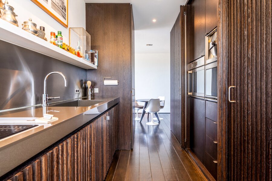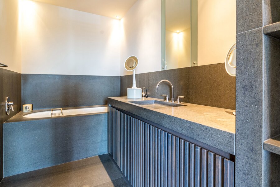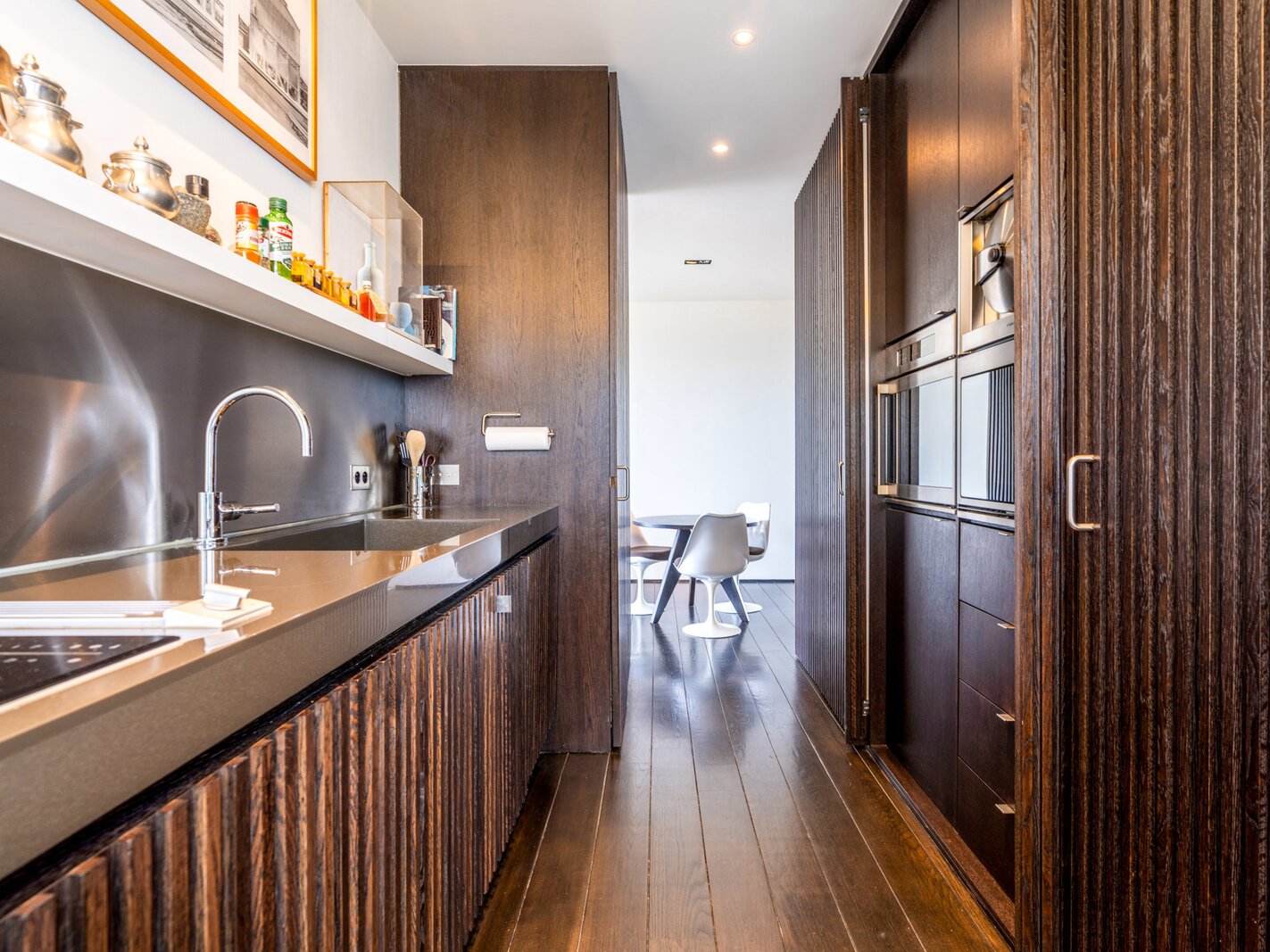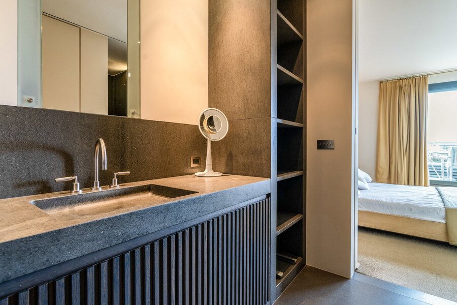 L’appartement se compose d’un hall d’entrée avec vestiaire et toilettes invités, menant au séjour lumineux avec cheminée d’ambiance et accès direct à la terrasse avant. La cuisine entièrement équipée dispose d’appareils haut de gamme (machine à café encastrée, presse-agrumes, etc.) et est attenante à une buanderie équipée (lave-linge, sèche-linge et système de tri). La chambre principale comprend une salle de bains avec douche à l’italienne et baignoire (robinetterie Dornbracht), ainsi qu’un dressing en chêne avec possibilité d’aménager une chambre de bébé et des toilettes séparées. Ces espaces donnent accès à la seconde terrasse, à l’arrière, avec vue dégagée sur la ville.