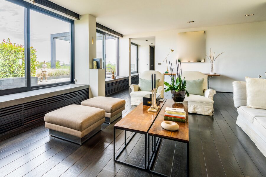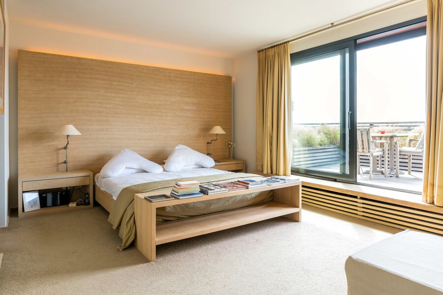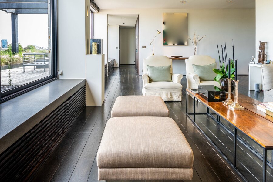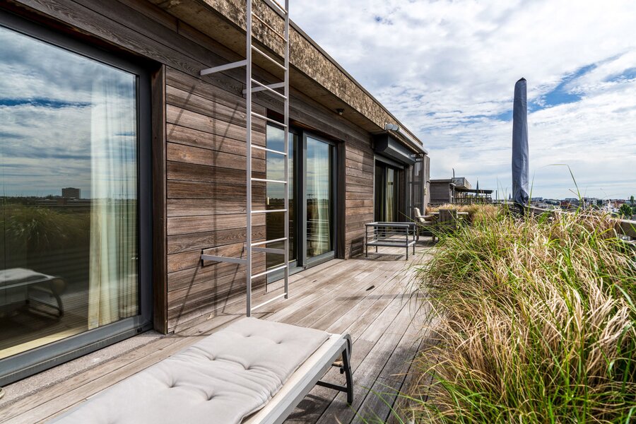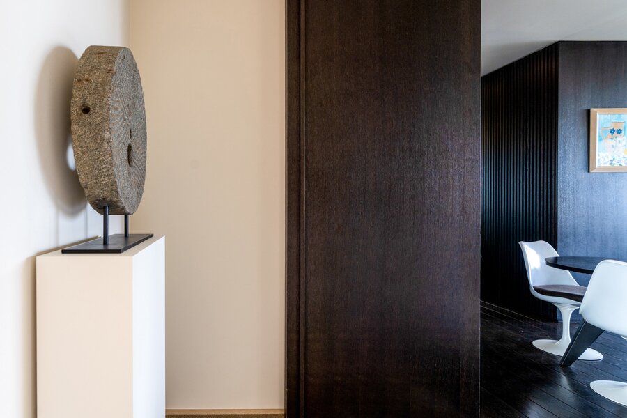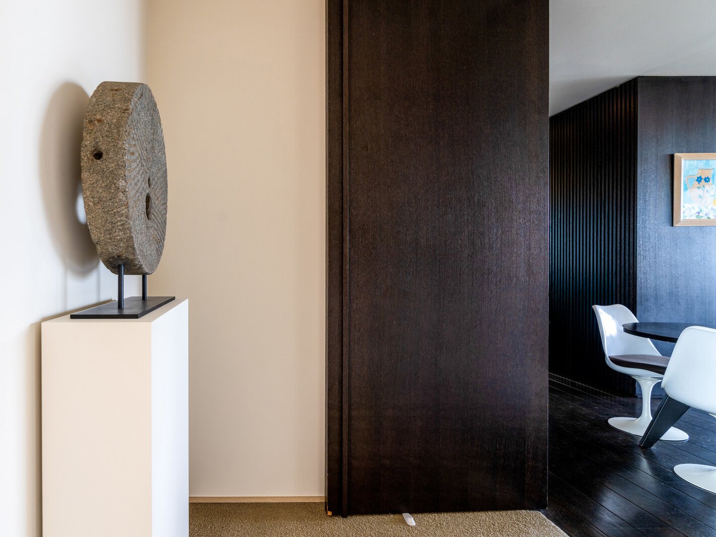 L’appartement se compose d’un hall d’entrée avec vestiaire et toilettes invités, menant au séjour lumineux avec cheminée d’ambiance et accès direct à la terrasse avant. La cuisine entièrement équipée dispose d’appareils haut de gamme (machine à café encastrée, presse-agrumes, etc.) et est attenante à une buanderie équipée (lave-linge, sèche-linge et système de tri). La chambre principale comprend une salle de bains avec douche à l’italienne et baignoire (robinetterie Dornbracht), ainsi qu’un dressing en chêne avec possibilité d’aménager une chambre de bébé et des toilettes séparées. Ces espaces donnent accès à la seconde terrasse, à l’arrière, avec vue dégagée sur la ville.