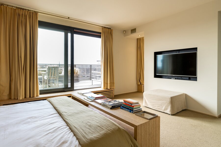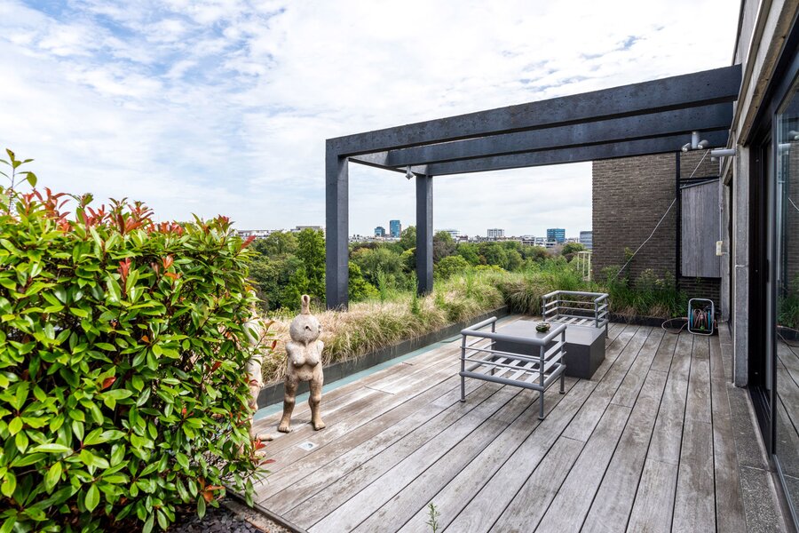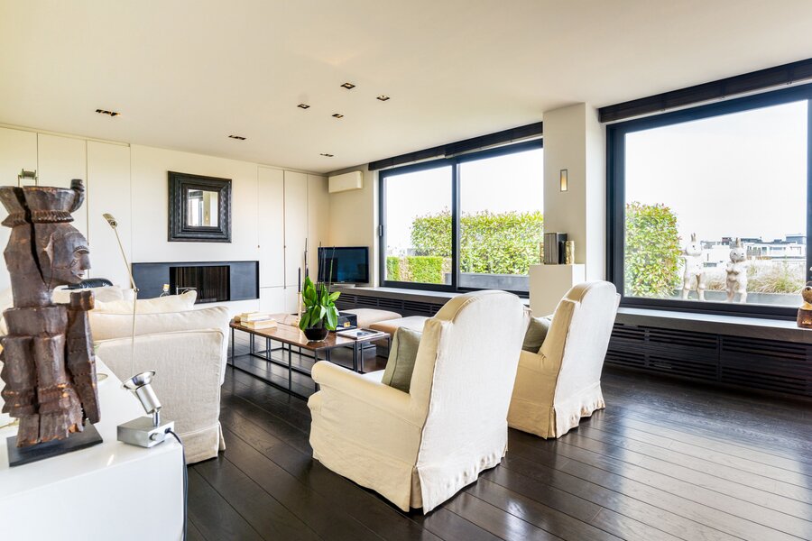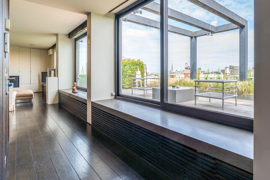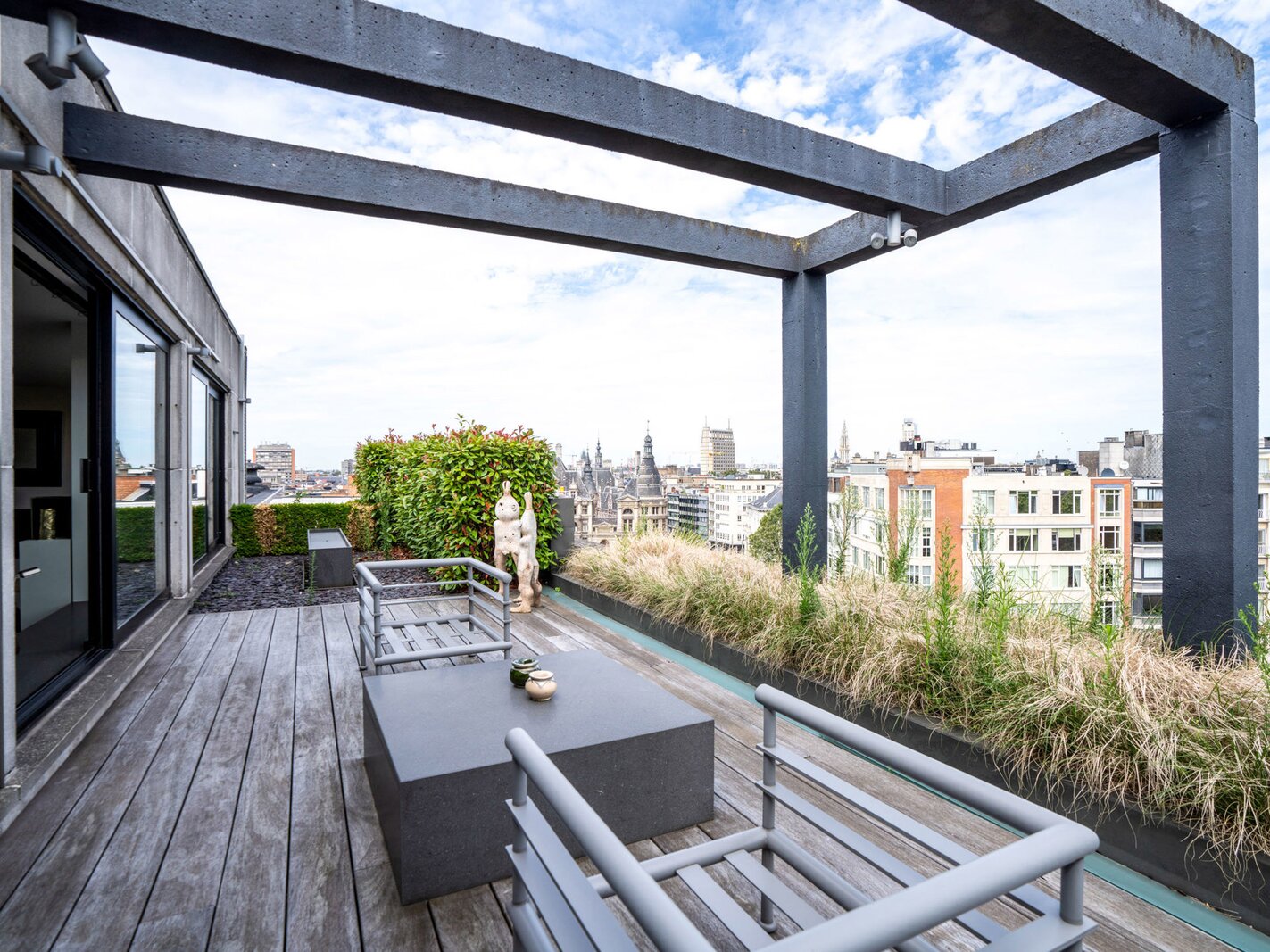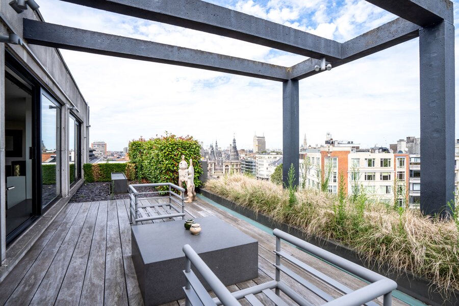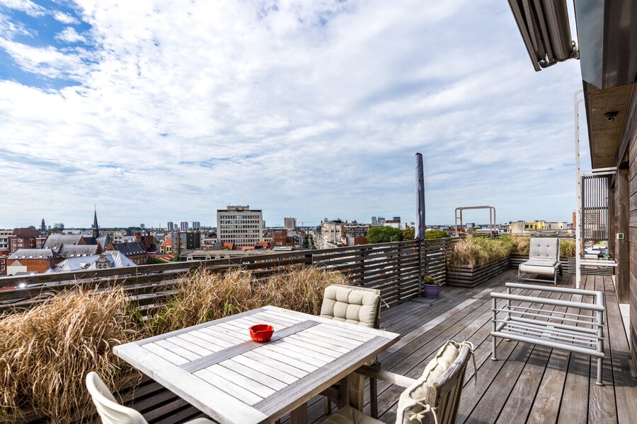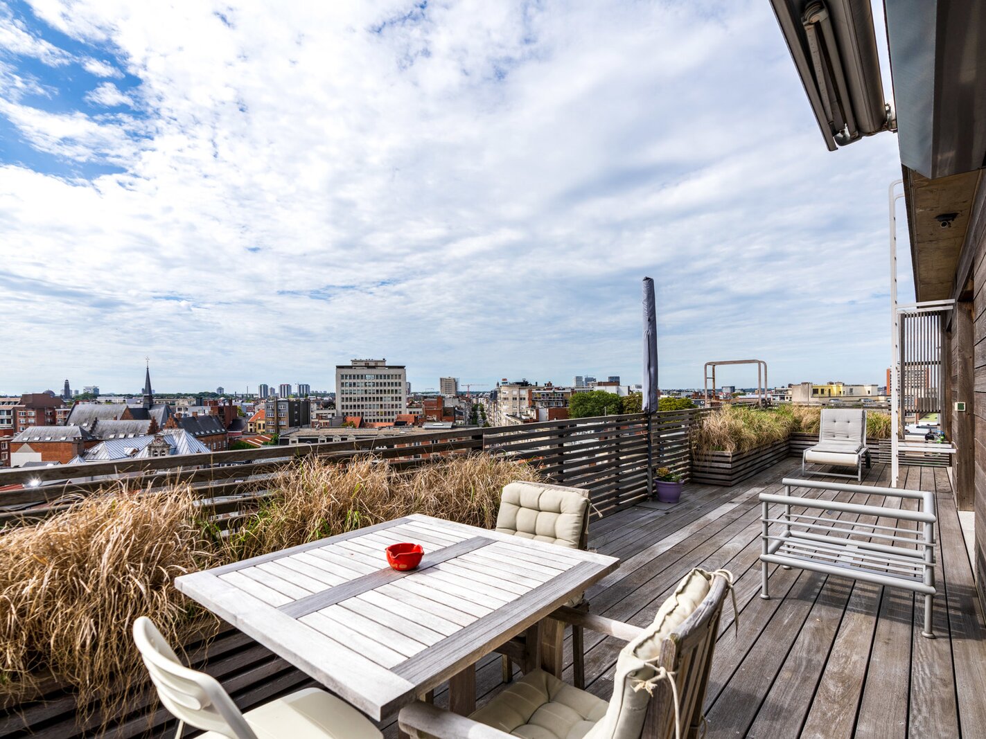 Situé à proximité du parc municipal, appartement meublé de ± 160 m² au dernier étage, avec deux terrasses ensoleillées offrant une vue panoramique à 180° sur la ville.