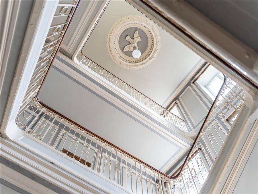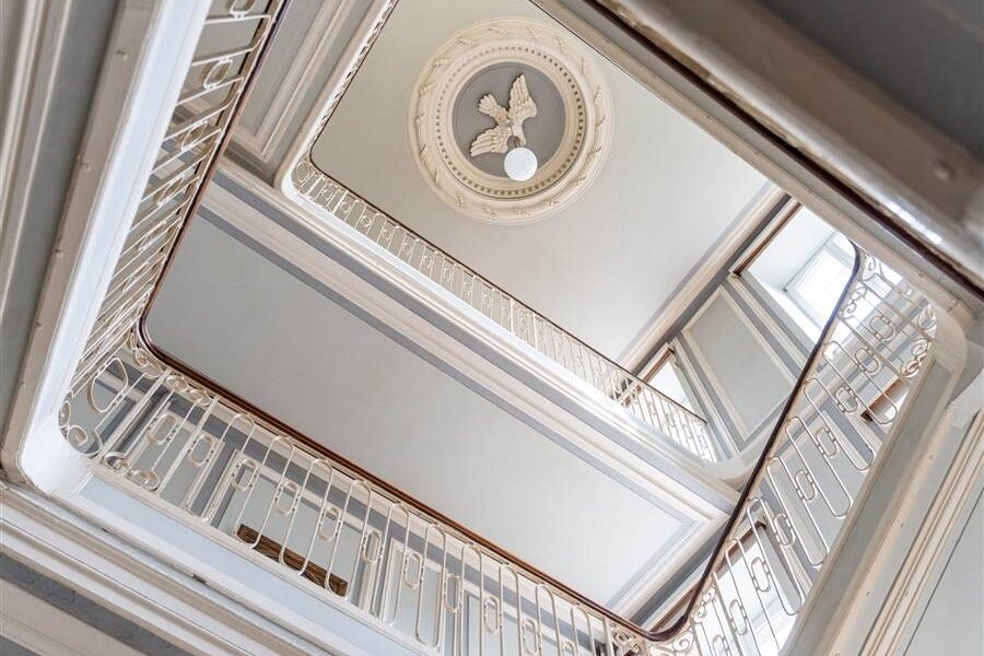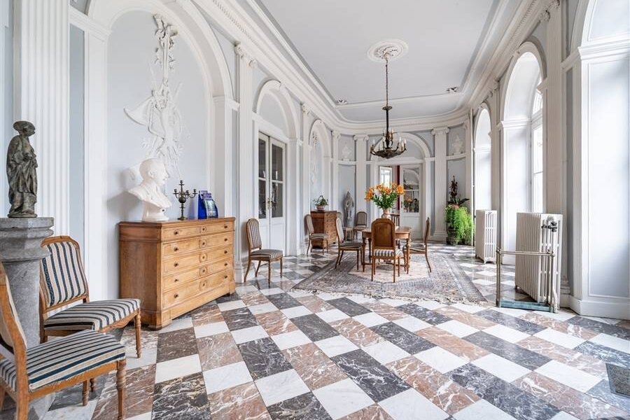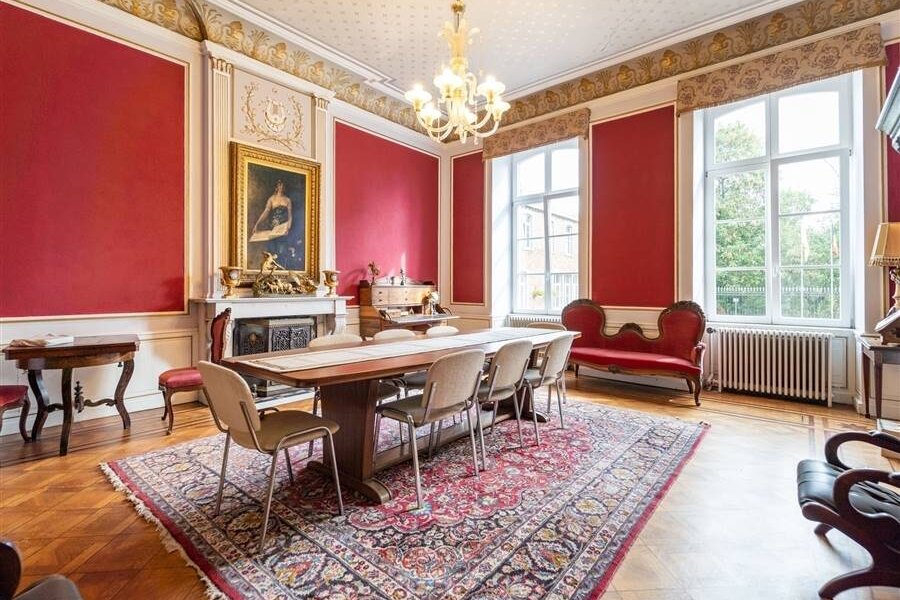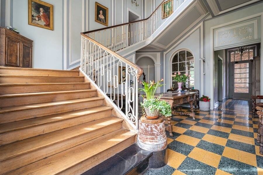 De imposante ontvangstruimte/inkomhal geeft toegang tot een ruim salon, een eetkamer, verschillende burelen en keuken. De prachtige trappenhal leidt naar verschillende étages met gezellige salons en privévertrekken.