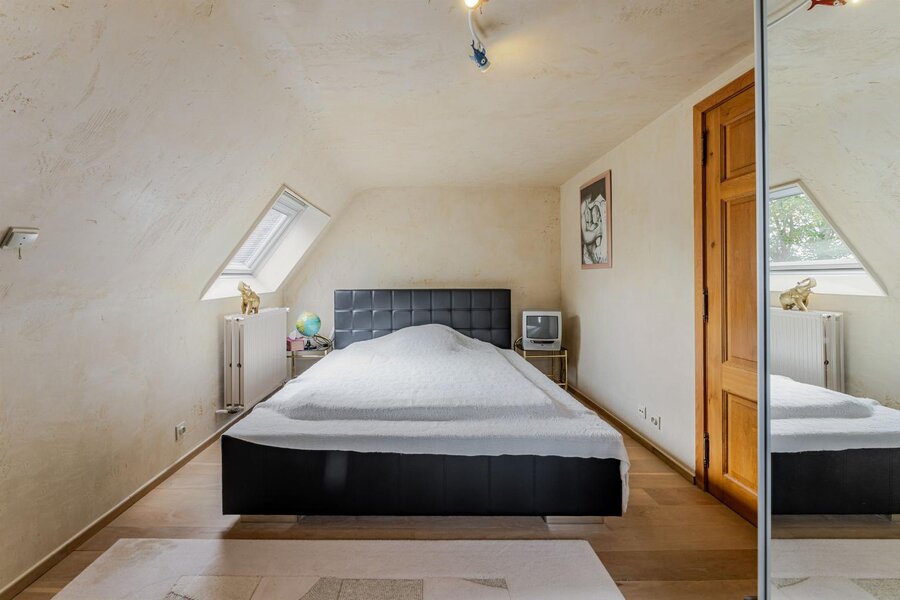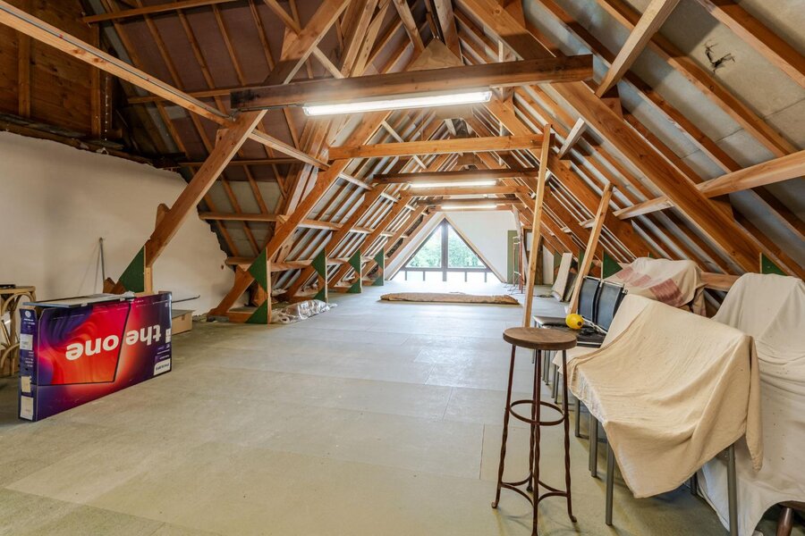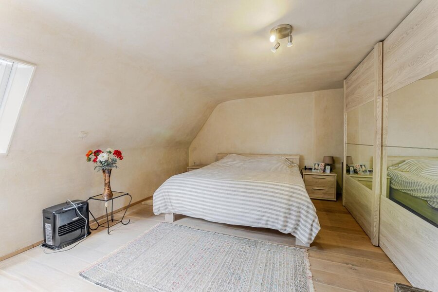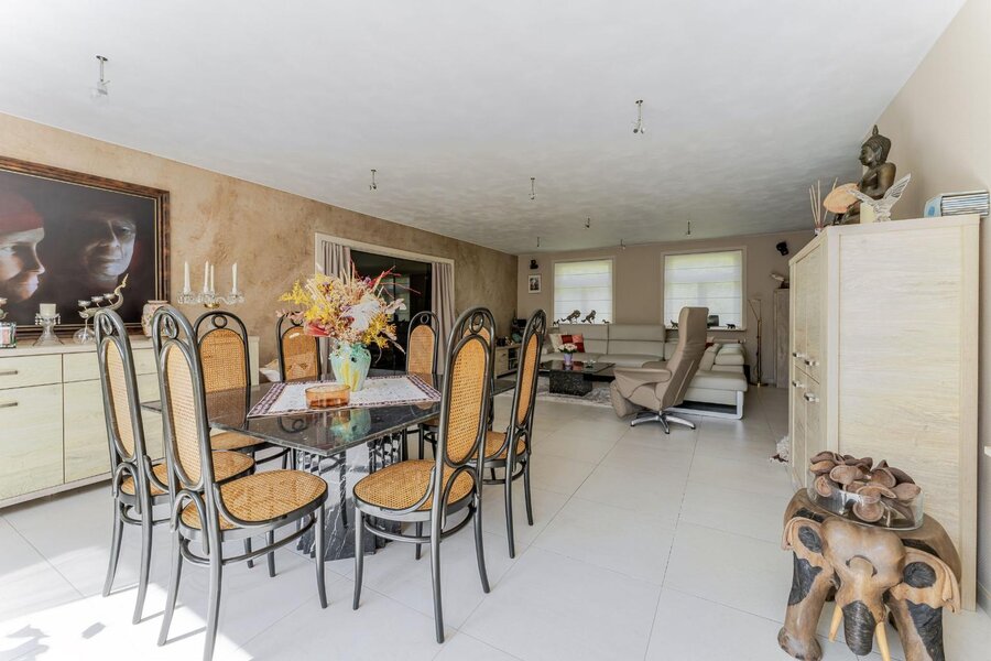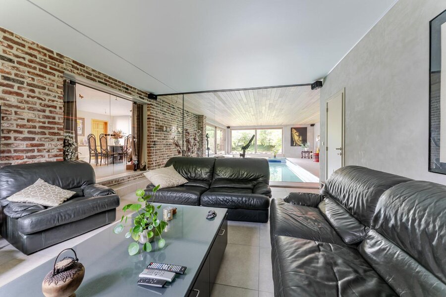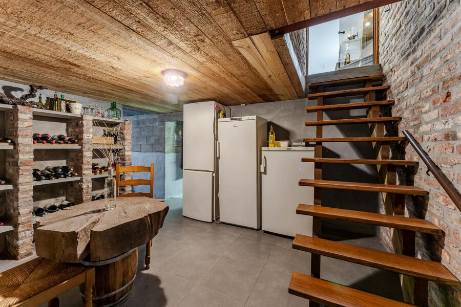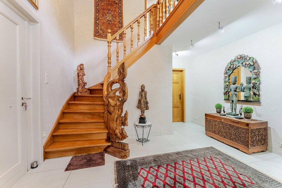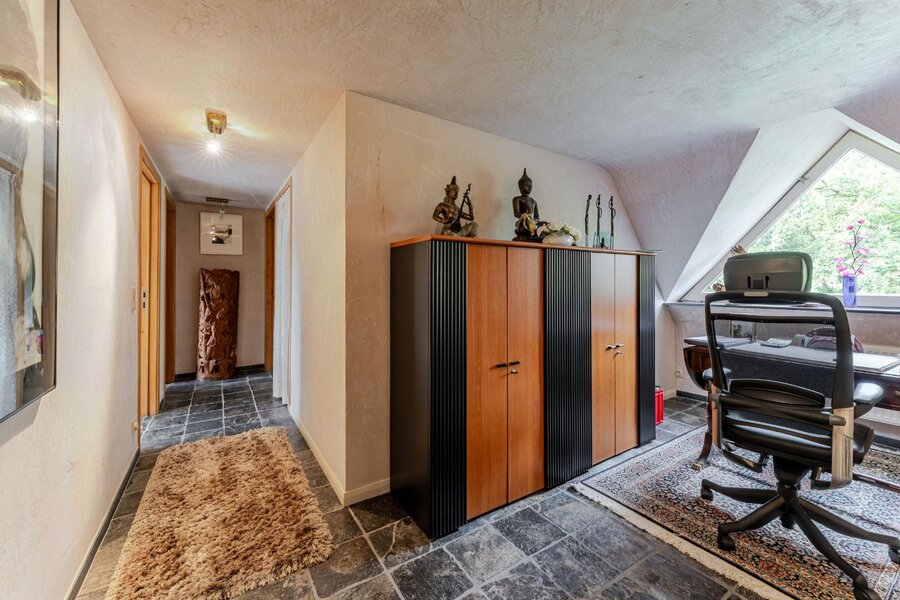 En entrant, vous trouverez un hall d'entrée accueillant avec toilettes pour invités. Le salon lumineux avec cheminée et un coin salon supplémentaire créent des moments conviviaux avec la famille et les amis. La cuisine s'ouvre parfaitement sur la buanderie pratique. Au rez-de-chaussée, il y a aussi une salle de bains et une magnifique piscine intérieure chauffée, entièrement rénovée il y a quatre ans et équipée de sa propre douche et toilettes.