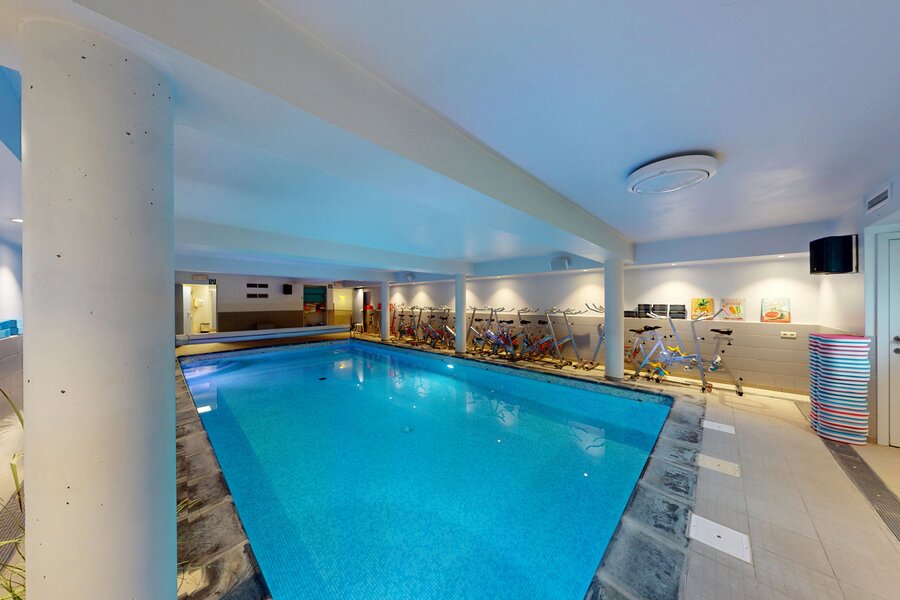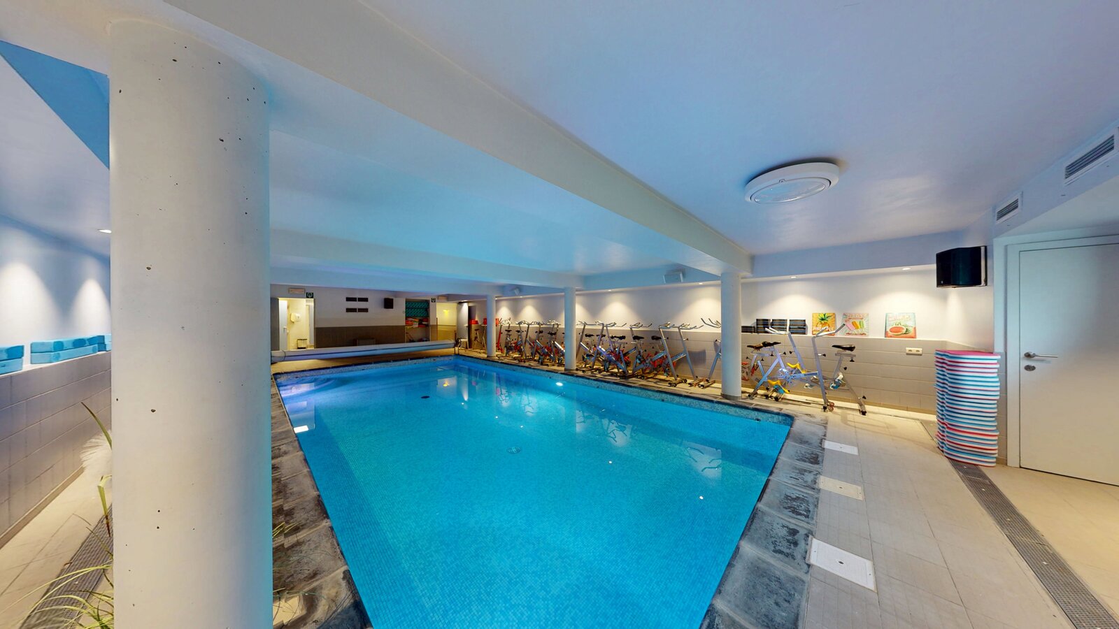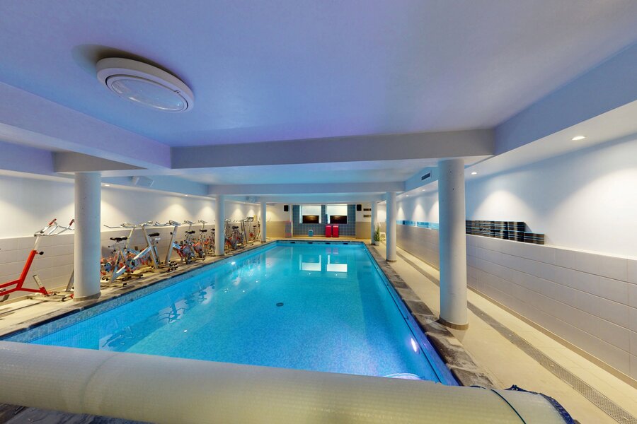 Piscine intérieure mosaïque (10 m x 5,5 m, profondeur 1,4 m), Traitement par électrolyse de sel.
