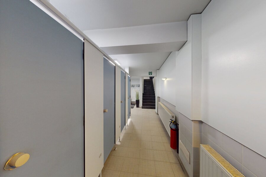 Espace vestiaire comprenant des cabines individuelles, un espace douche et un WC pour personne à mobilité réduite